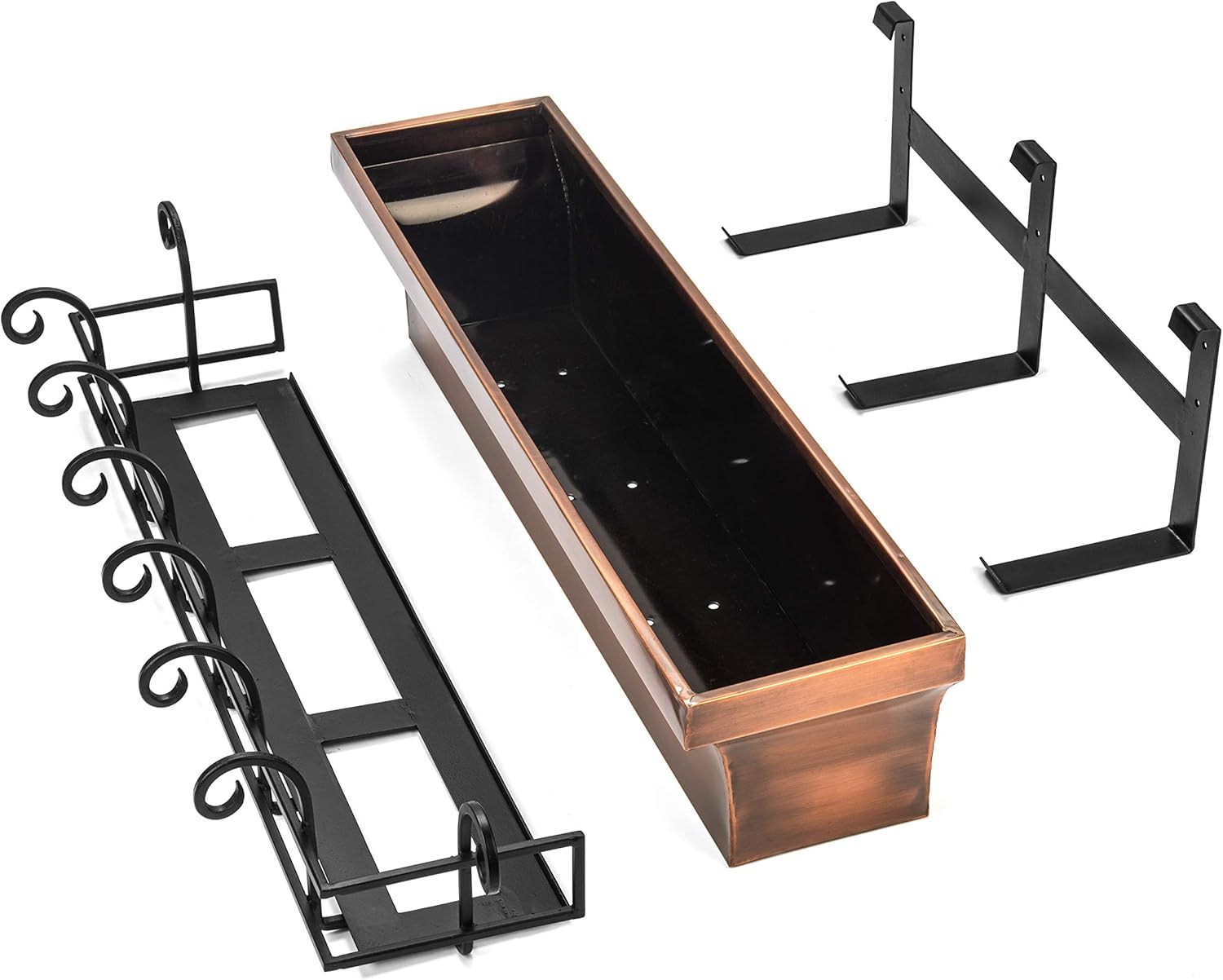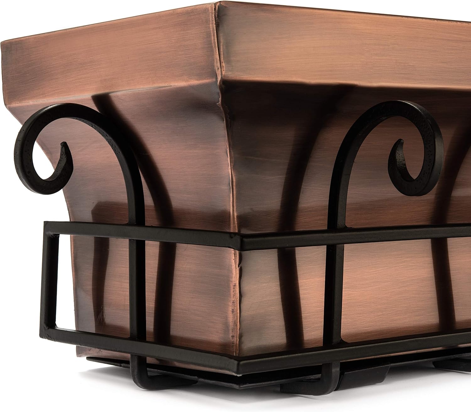- 36 inch window boxes for the home – The rich color of this flared window box adds an extra layer of depth to any outdoor decor. The antique copper finish is perfectly paired with the black powder coat of the frame, and is accentuated by the scroll work on the frame. The wide mouth at the top of the window flower box allows your flowers to breathe and grow throughout the box. The sturdy but lightweight design allows the easy to remove brackets to functionally support the window box.