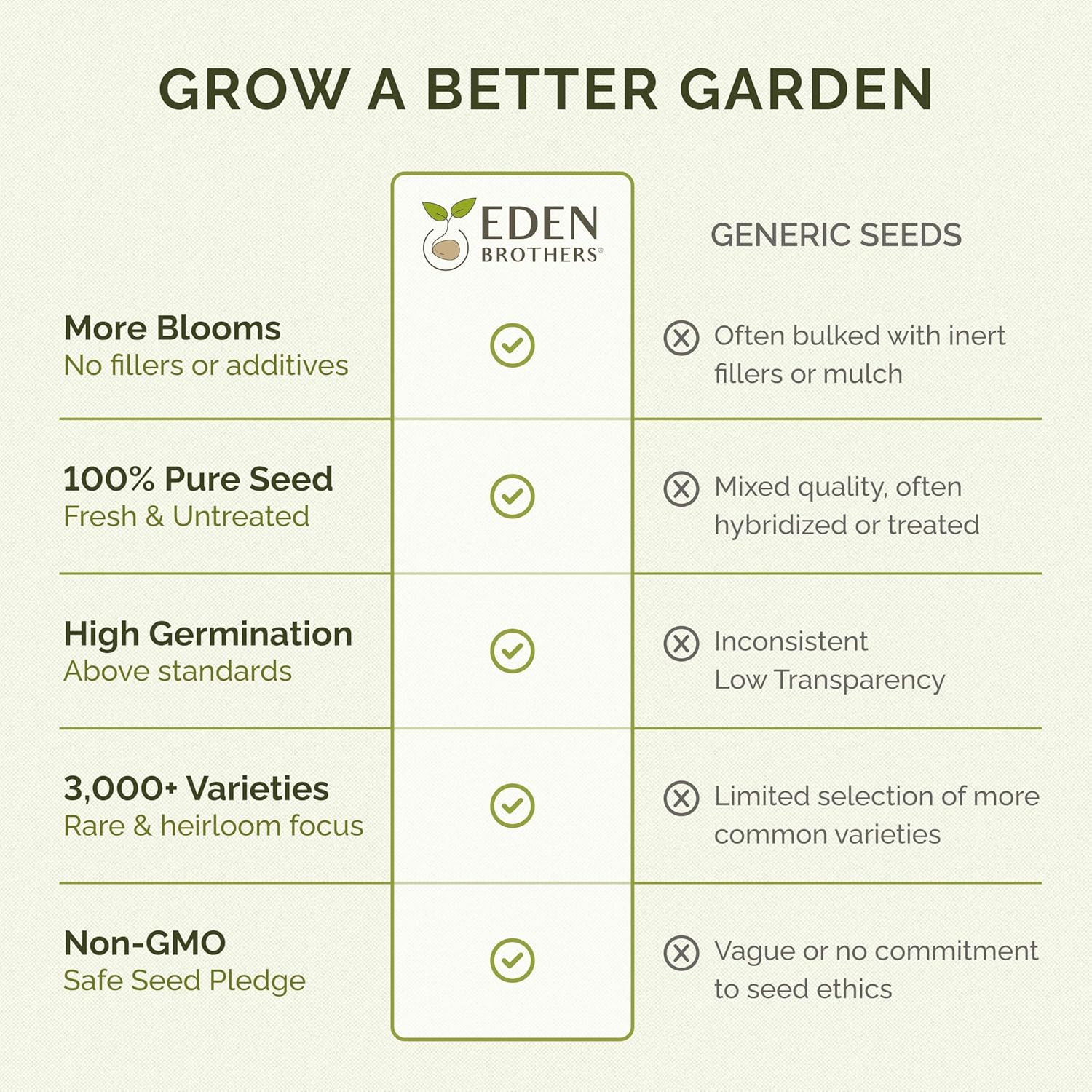 - High Germination - Eden Brother seeds are fresh, 100% pure, high germination, and non-GMO. Always. Our germination rates far exceed industry standards when planted according to instructions.