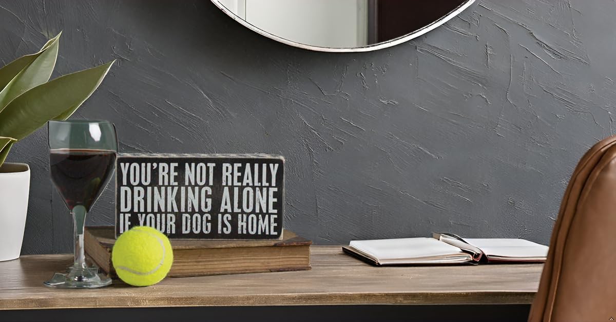 - INSPIRATIONAL QUOTE - The sign reads 'You're not really drinking alone if your dog is home' serving as an inspirational desk decor that also adds a touch of humor to your home.