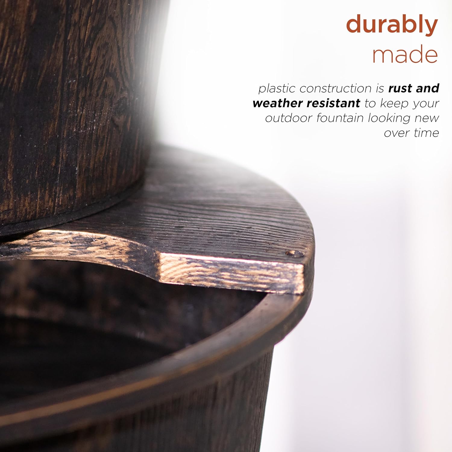 - RELAXING WATER FLOW: Water trickles from the pump spout into the barrel tiers, adding a peaceful ambiance to your outdoor setting