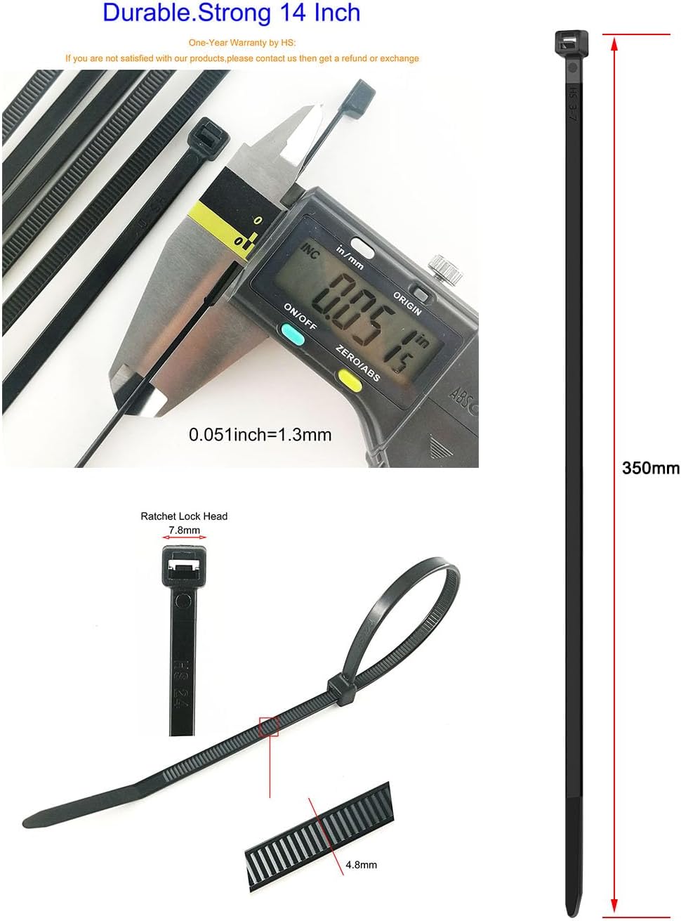 HS 14 Inch Plastic Wire Zip Ties UV Resistant for Fencing Camping Outdoor Purpose 100pcs,50 LBS Strength Heavy Duty Long Cable Tie Wraps 14" Black