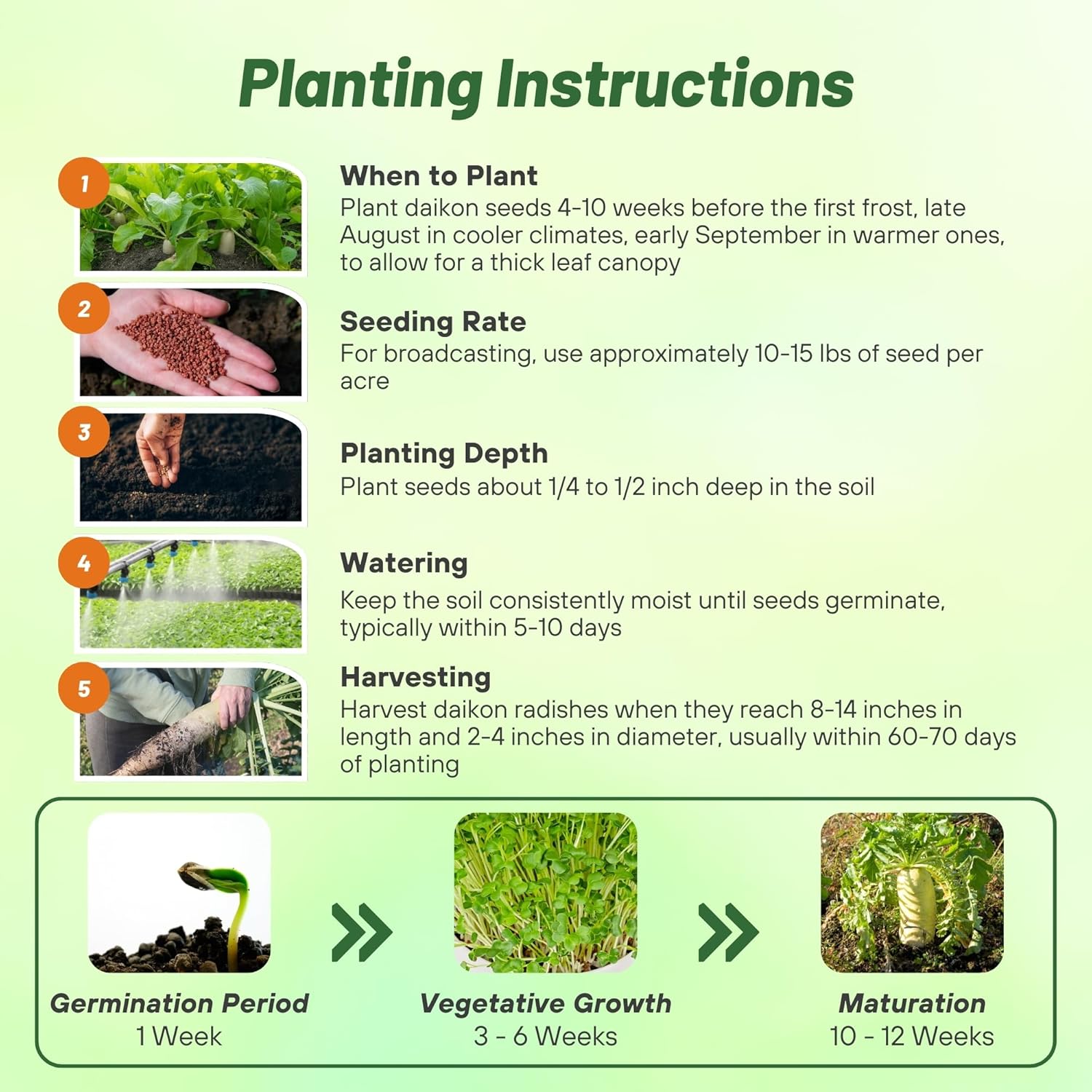 - WINTER COVER CROP FOR SOIL HEALTH & EROSION CONTROL: Plant Daikon radish seeds 4-10 weeks before the first frost to form a protective canopy that shields the soil from erosion and helps retain essential nutrients. These radish seeds for planting are perfect for food plots, gardens, and soil health improvement.