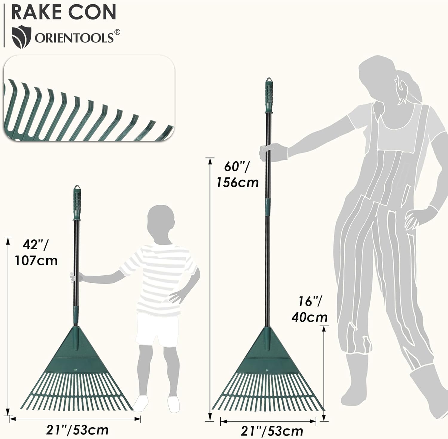 ORIENTOOLS Garden, Adjustable Lightweight Steel Poly Shrub Rake, Plastic Head, 22 Tines, 42 to 60 inches (Black Handle)