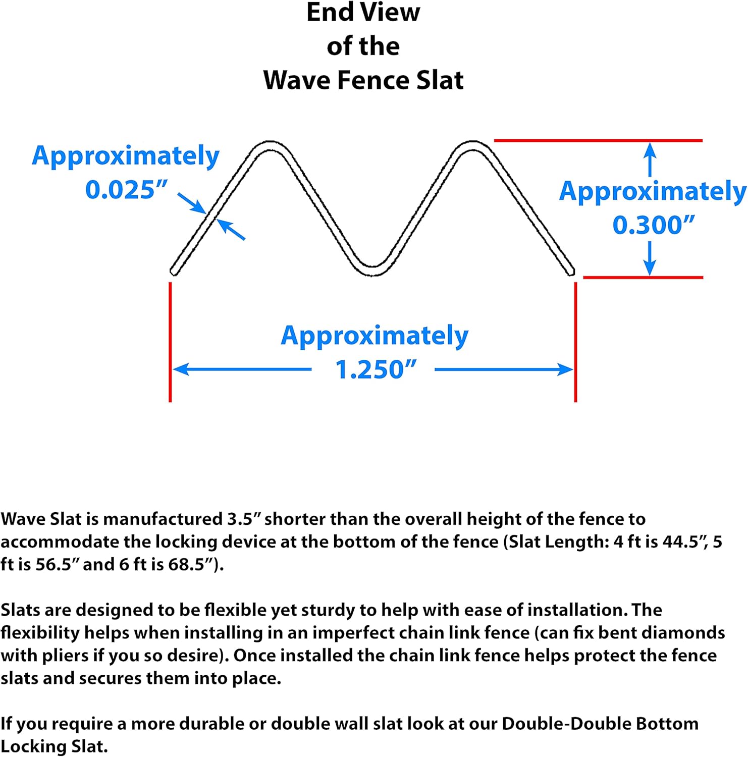 - Sky Blue Fence Slat - Designed for a 5' high fence, slats are approximately 56.5" in length to accommodate the bottom locking channel and to prevent the slats from being above the top of the fence. (Available Colors: Beige, Black, Brown, Gray, Green, Redwood, Royal Blue, Sky Blue, White)