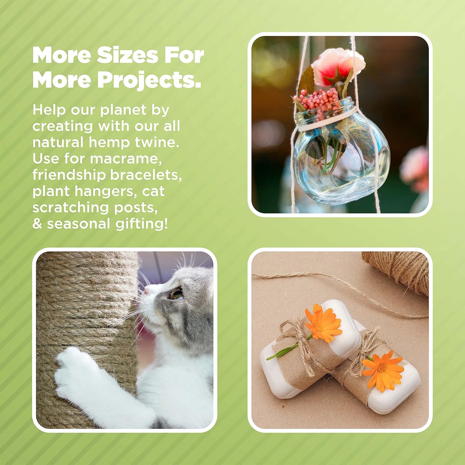 - πππππππ ππππππππ: Our organic hemp twine is made from natural, chemical-free fibers that are strong, durable and biodegradable. It is a safe and sustainable choice for environmentally conscious users. It securely holds knots and withstands frequent use, ensuring reliable, long-lasting performance every time.