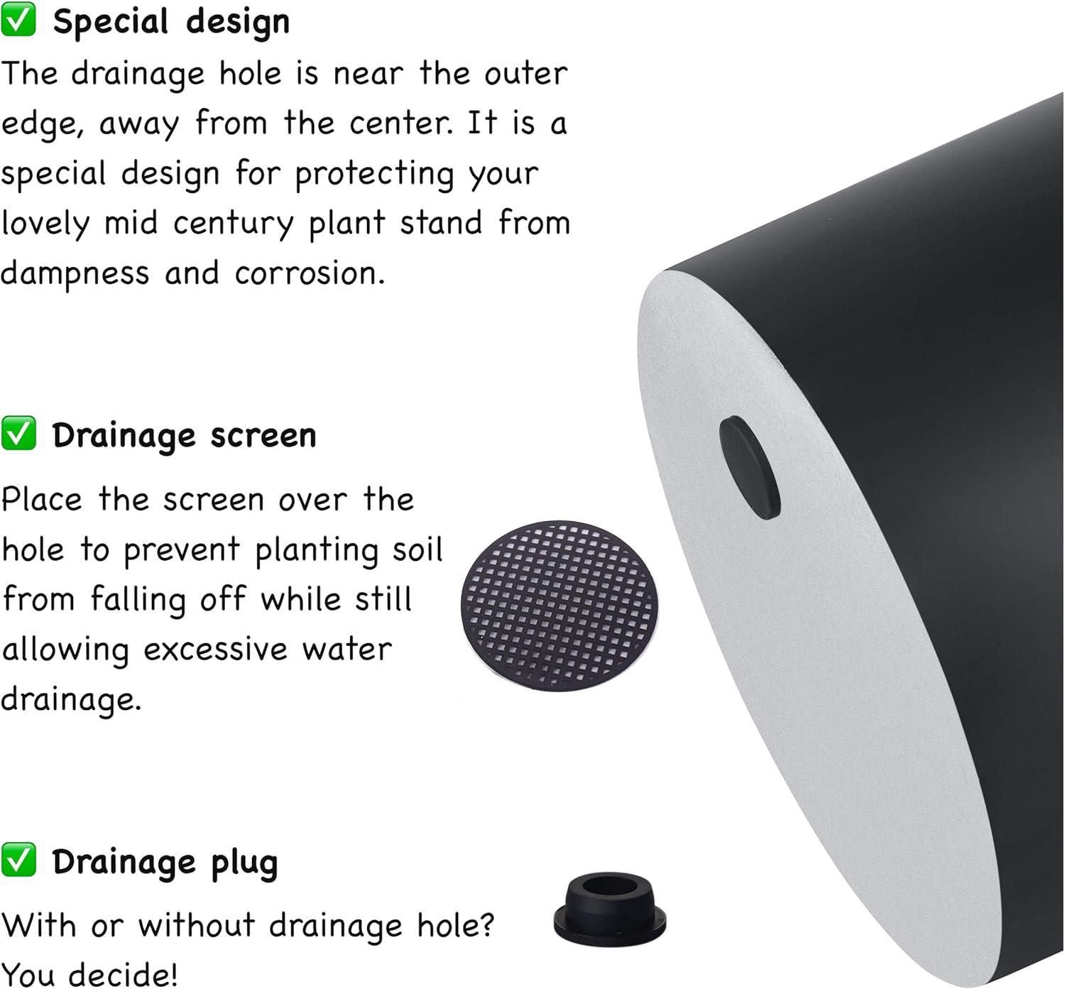 - DRAINAGE PLUG & MESH SCREEN- With a large drainage hole at the bottom of planter pot for appropriate draining, each pot contains a rubber drainage plug, your choice of draining your plants or not. It also comes with drainage mesh screen, place the screen over the hole to prevent planting soil from falling off while still allowing excessive water drainage.