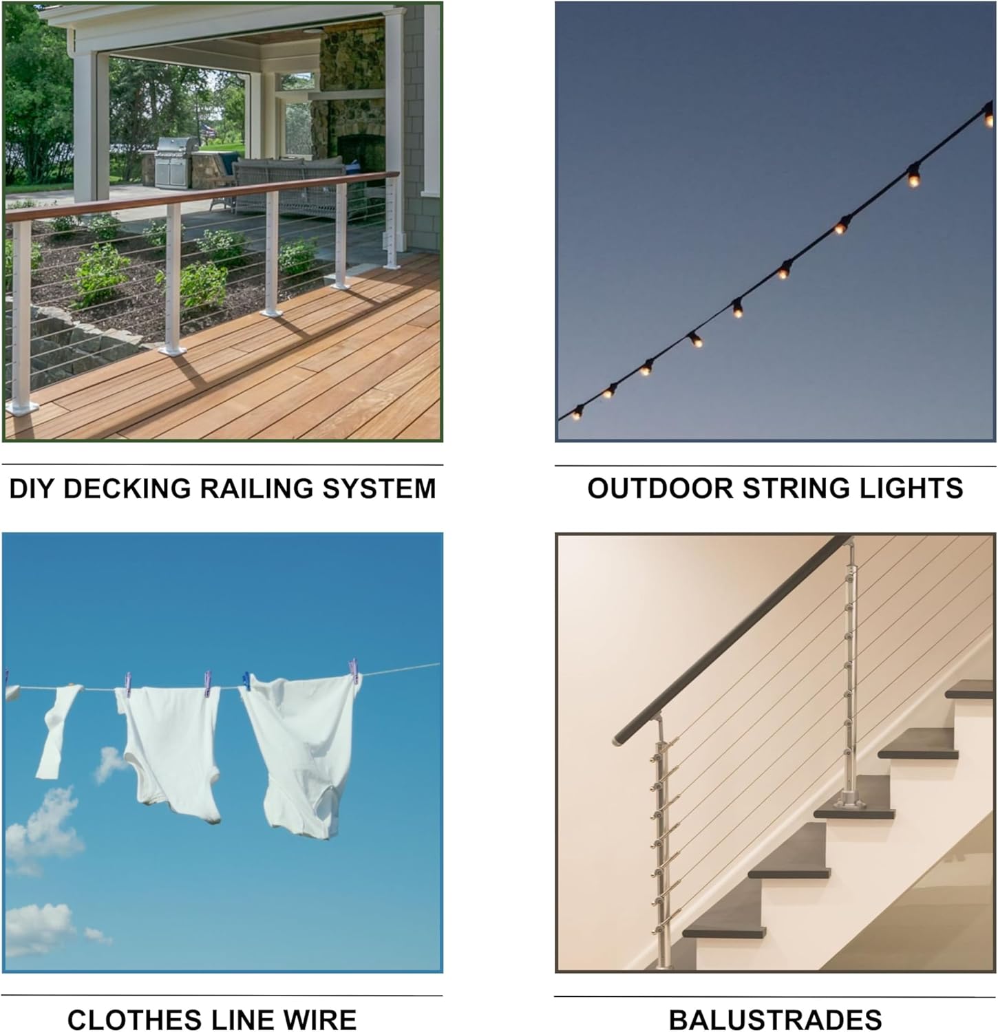 - Wide Range of Applications: Suitable for rigging, lifting, towing, hoisting, DIY decking railing projects, clothes line wires, string lights, multipurpose crafts, hobby wire, indoor and outdoor use in yards, gardens, making it a versatile solution for industrial, commercial, and residential use.