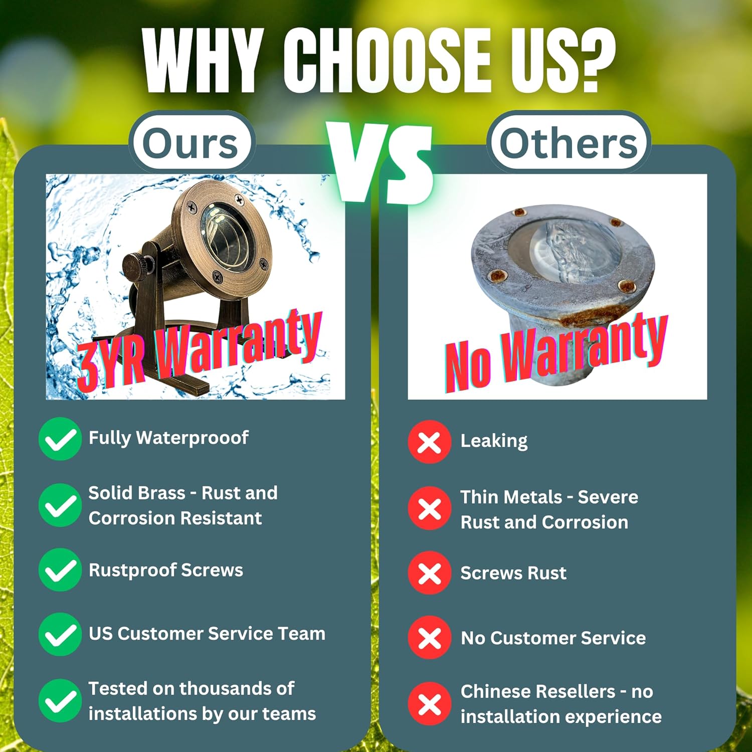 - {Long Lasting Quality} Professional quality submersible LED lights made from brass metal that do not leak, rust or corrode. These durable bronze finish underwater lights, pond lights and fountain lights are completely water tight when new upgraded rustproof screws are tightened all the way to prevent water light leaks. The pond waterfall outdoor landscape light wire exit is insulated to prevent moisture from entering to ensure long-term use. IP 68 waterproof pond fountain yard lights