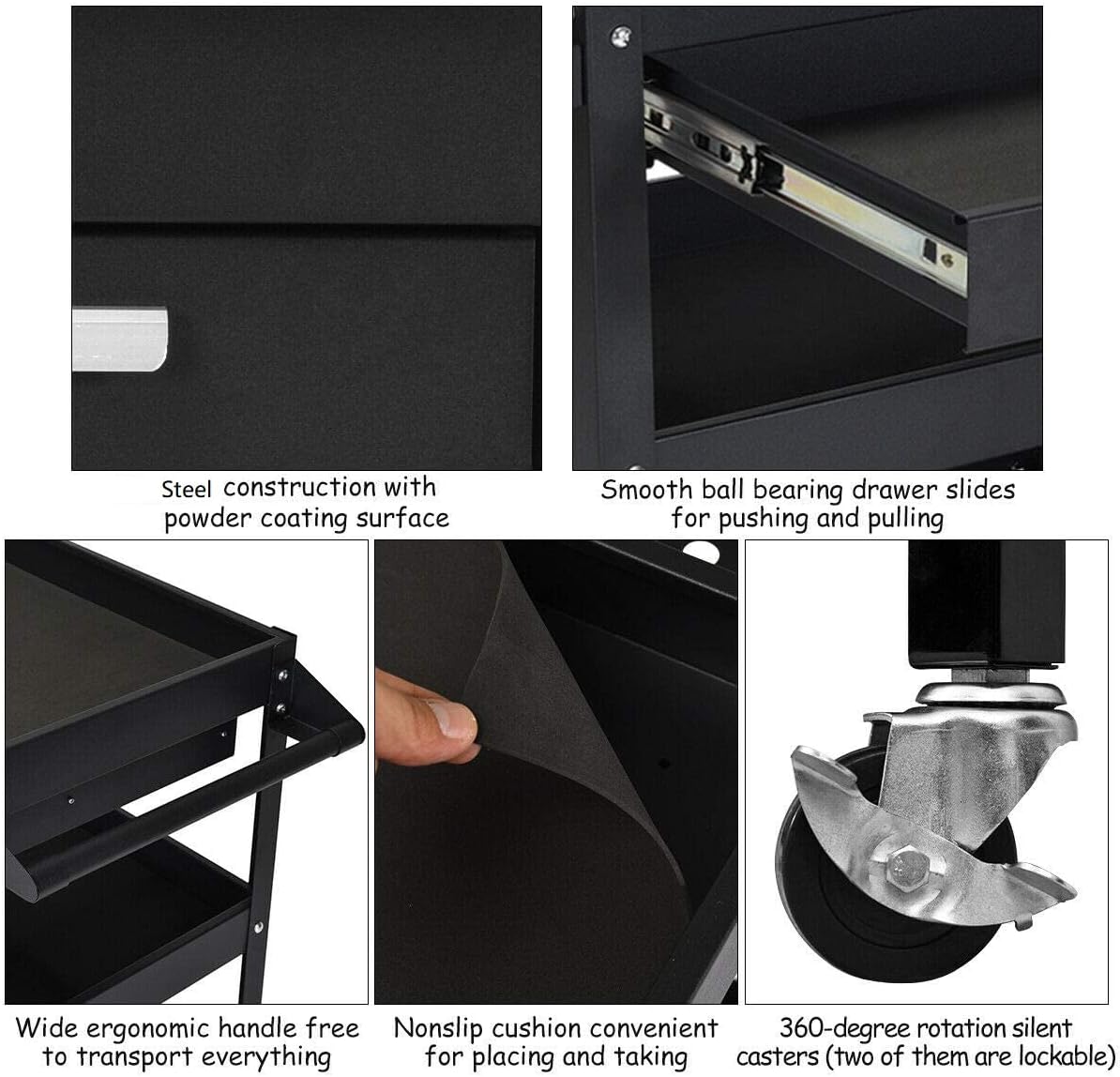 - Organize all Tools: The rolling tool cart features a multi-layer storage design, which includes three trays (16” x 24”) with wear-resistant cushions, a sliding utensil drawer, a convenient plug for carrying small parts. You’re free to keeps tools within arm’s reach when in need and transport heavy stuff at without needing extra help.