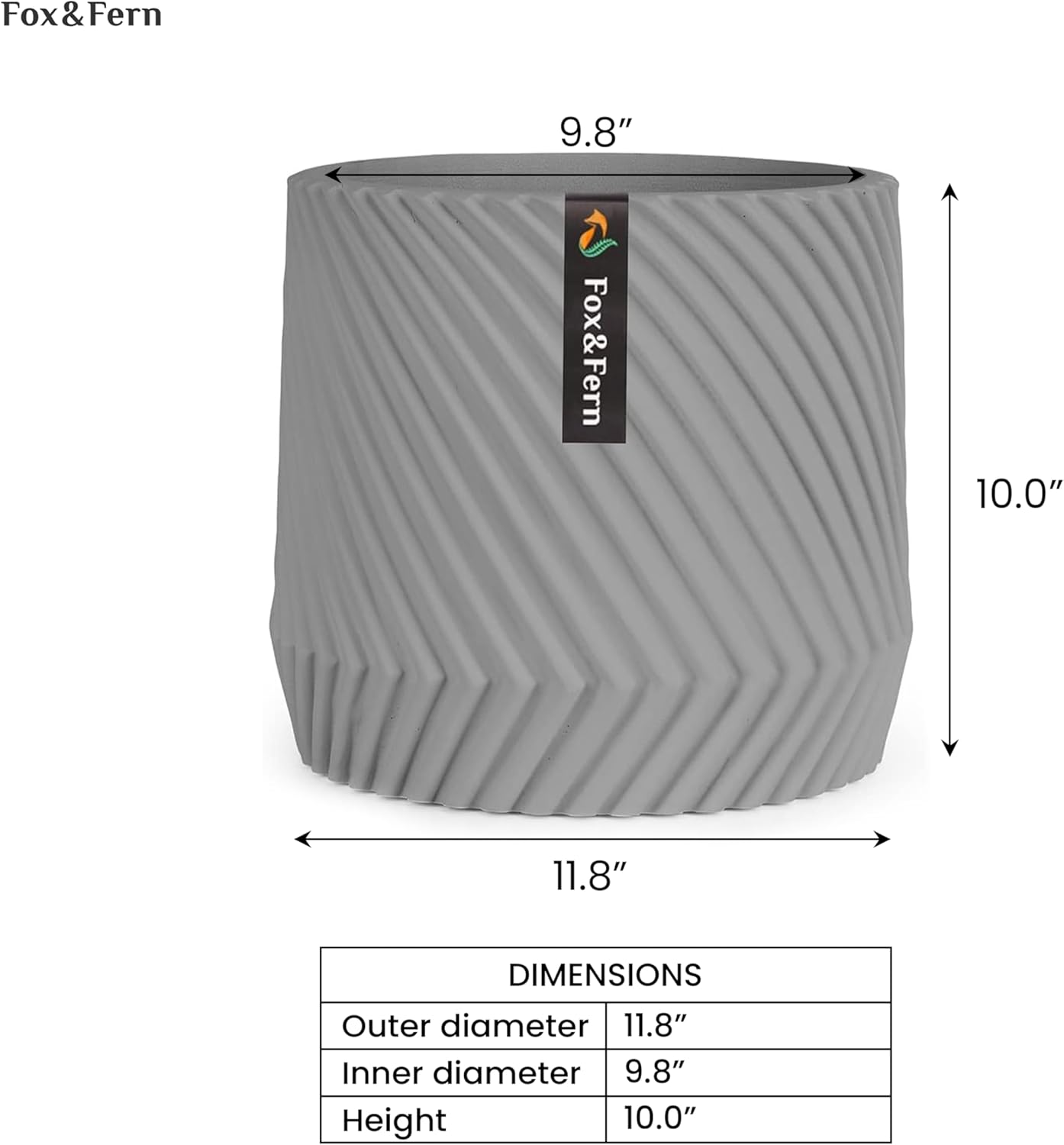 Fox & Fern Large 12 Inch Planter — Premium Polystone Gray Plant Pot with 3D Texture and Drainage Plug; 12 Inch Pots for Plants Indoor; Large Planter for Indoor & Outdoor Plants