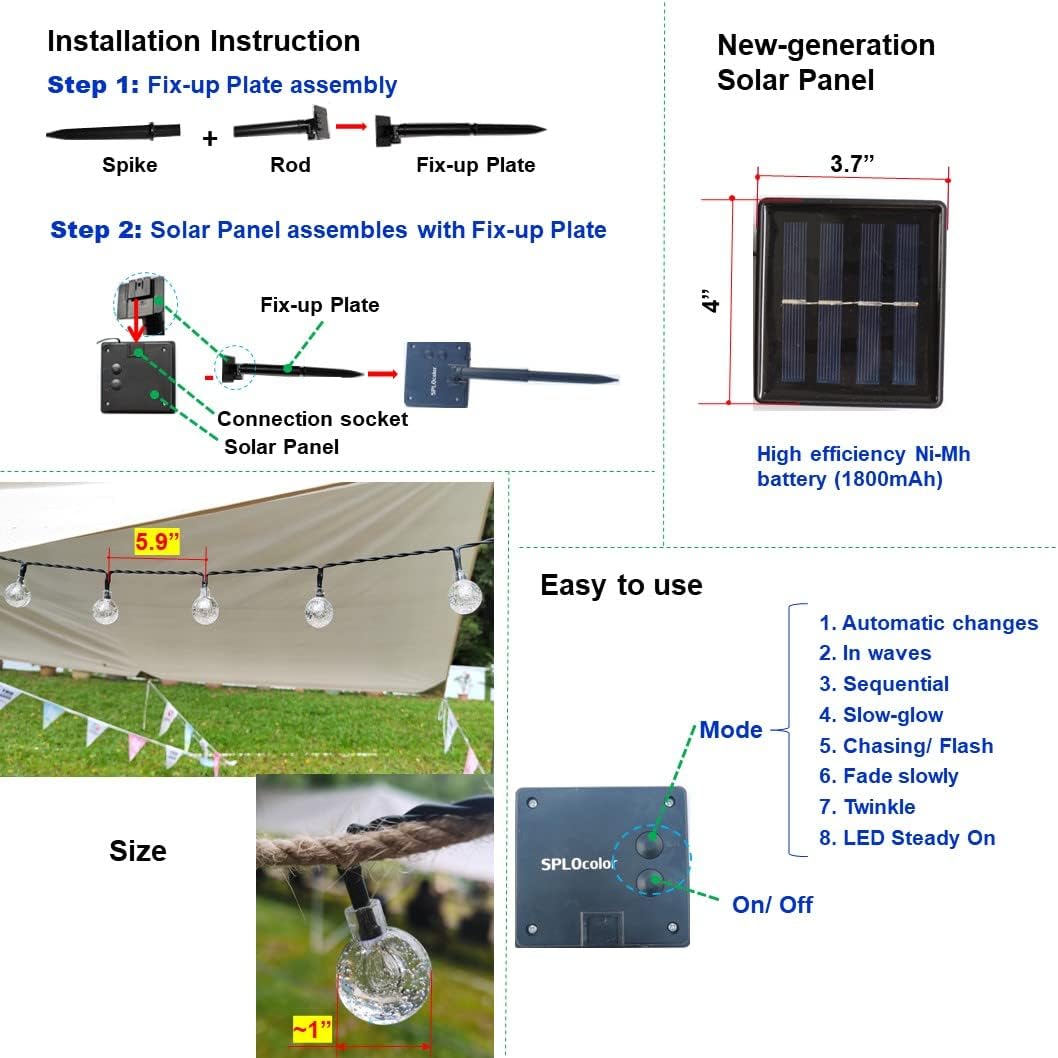 - Long working time - With a full charge of 6-8 hours, the fairy lights will provide lighting for 8-10 hours.Manganese element are added into the SPLOcolor Tech Solar Light Batteries to ensure that solar battery can be charged in the Four seasons。