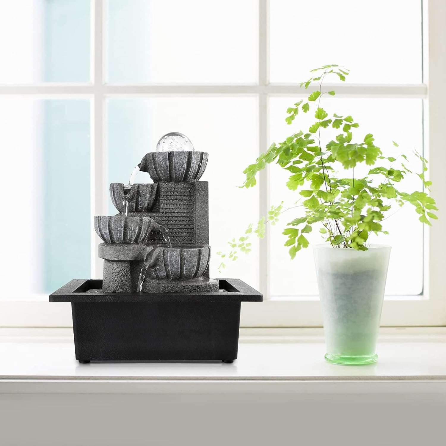 - [Decorative Water Fountains Indoor]- 4 Tier indoor tabletop water fountain with a quiet submersible pump to circulate the water and made gentle soothing sound of water for relaxing. The indoor water fountain with roll ball lights is suitable for any office, living room or modern home decor. (Size: 8.26*5.9*11.02 In)