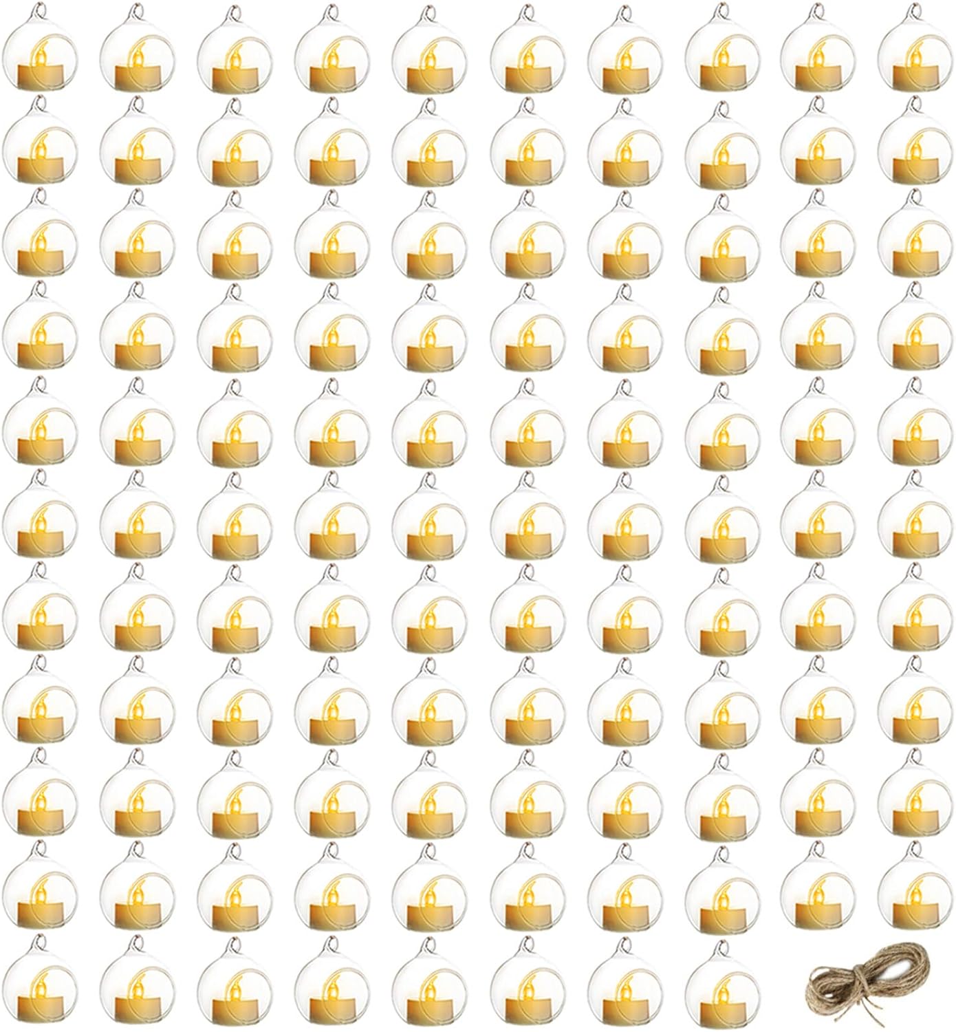 Sziqiqi Hanging Glass Globes Orbs Tea Light Candle Holders with Flameless LED Tealight for Wedding Ornaments, Wedding Birthday Christmas Party Centerpiece Accessory 2.36inch 100pcs +8 Extra