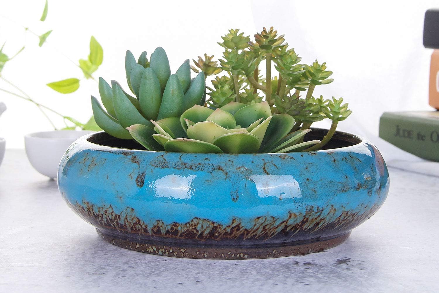 VanEnjoy 7.3 inch Round Large Shallow Succulent Ceramic Glazed Planter Pots with Drainage Hole, Bonsai Pots Garden Decorative Cactus Stand Flower Container (blue)
