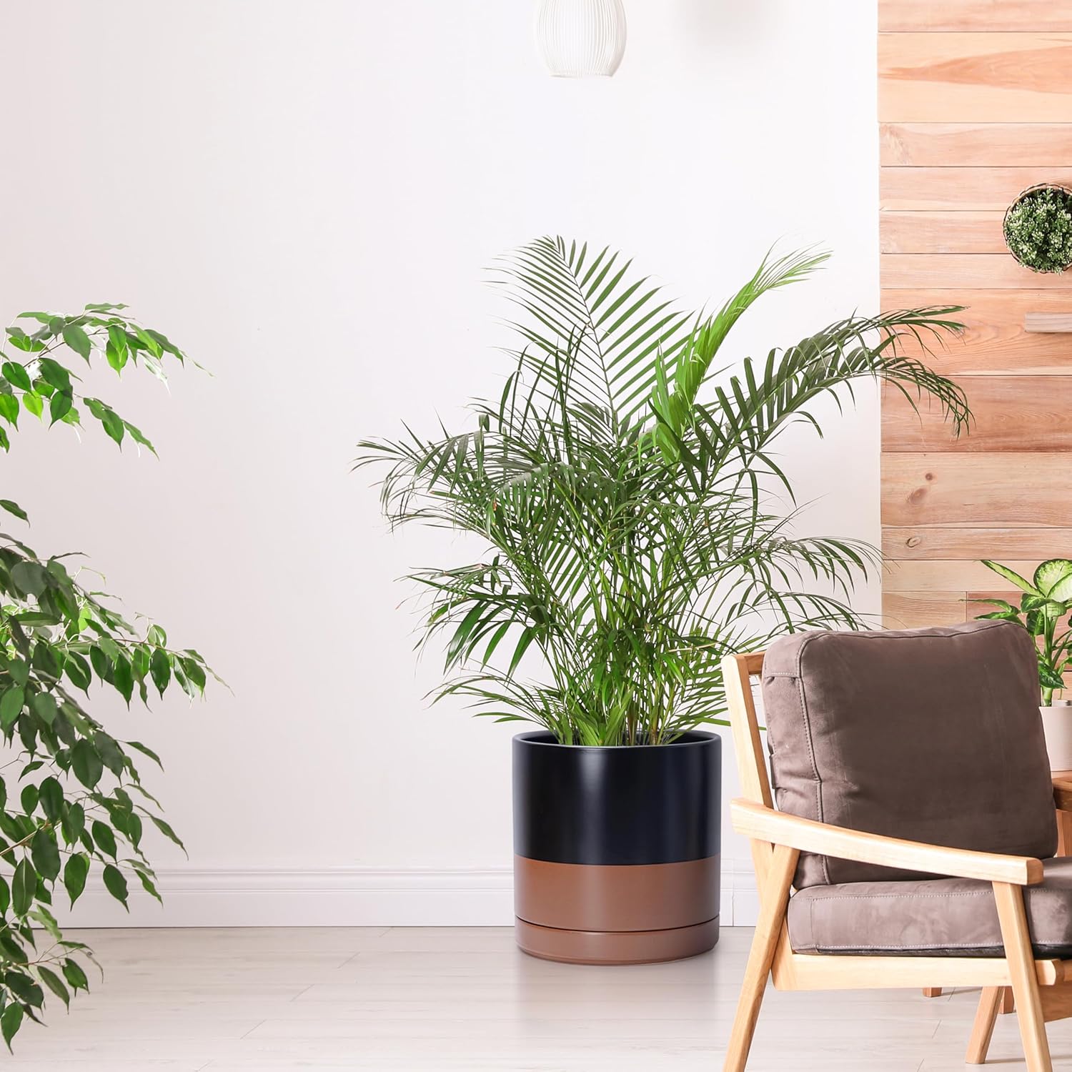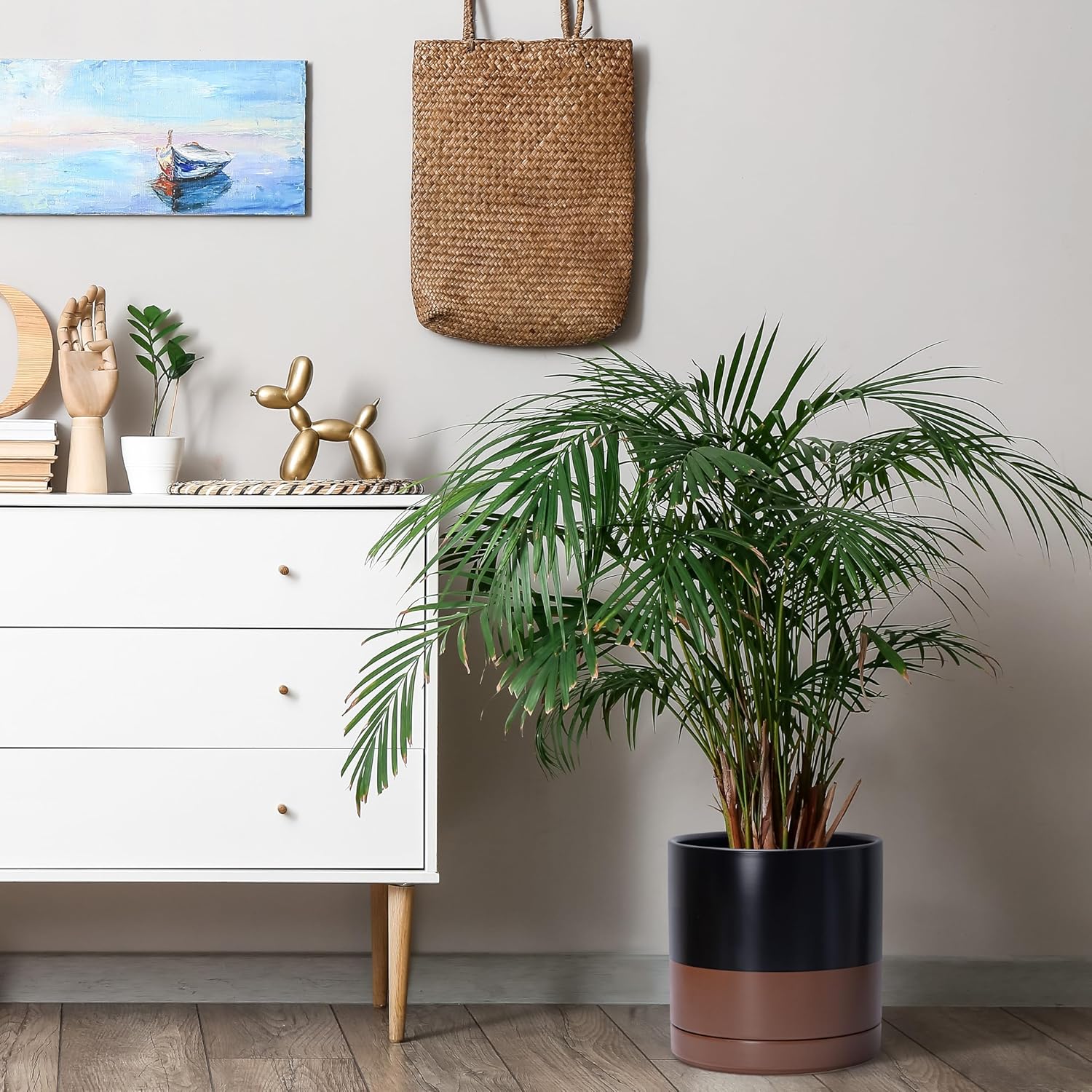 D'vine Dev 10 Inch, Ceramic Planter Pot with Drainage Hole and Saucer, Indoor Cylinder Round Planter Pot, Black/Speckled Tan, 94-O-E-7