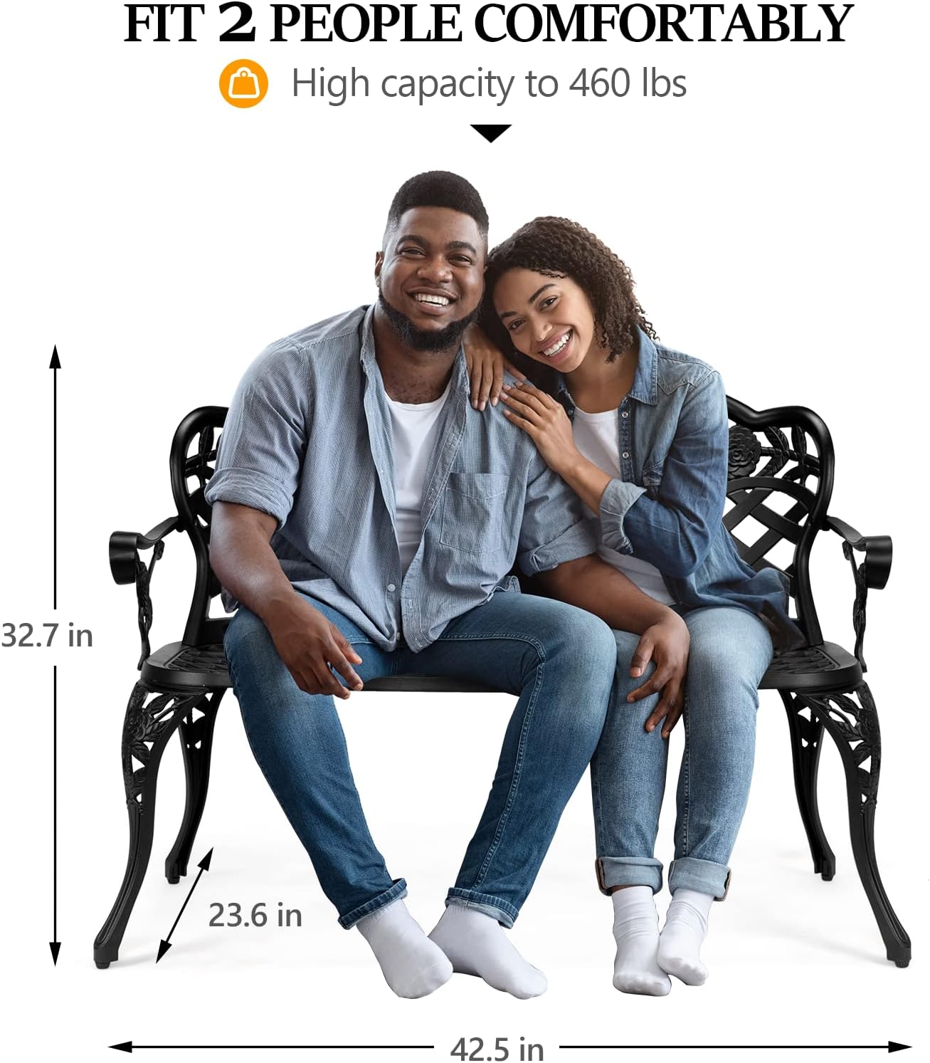 - Comfortable Seating: The outside iron benches feature a 42.5-inch seating surface with an ergonomically curved backrest that better conforms to the natural curve of your lower back. Accommodating 2-3 people, it's an excellent choice for driveways, backyards, or pathways, creating a cozy and free space for enjoying coffee or reading time with friends and family.