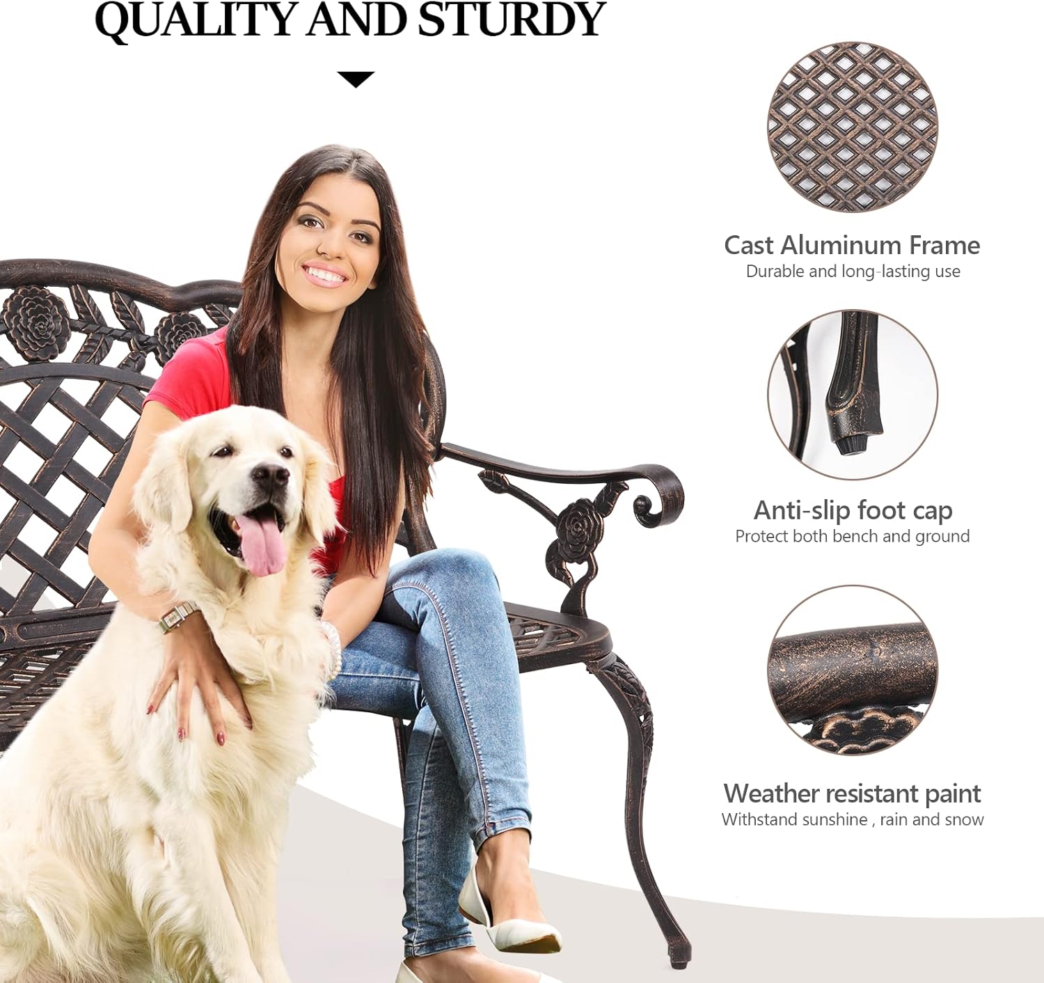- Robust Structure: This metal bench features a high-quality cast aluminum frame capable of supporting up to 530 pounds. Non-slip foot pads and sturdy chair legs provide dual reinforcement, ensuring stability during extended seating.