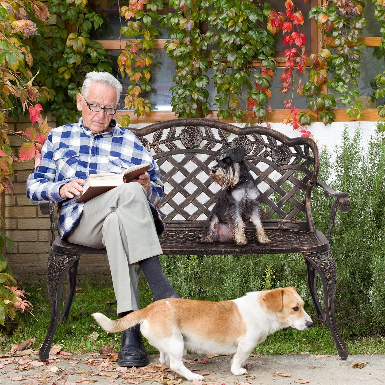 VINGLI 42.5" Patio Garden Bench Outdoor Metal Rose Loveseat, Cast Iron Cast Aluminium Frame Antique Finish Park Chair, Accommodates 2-3 People