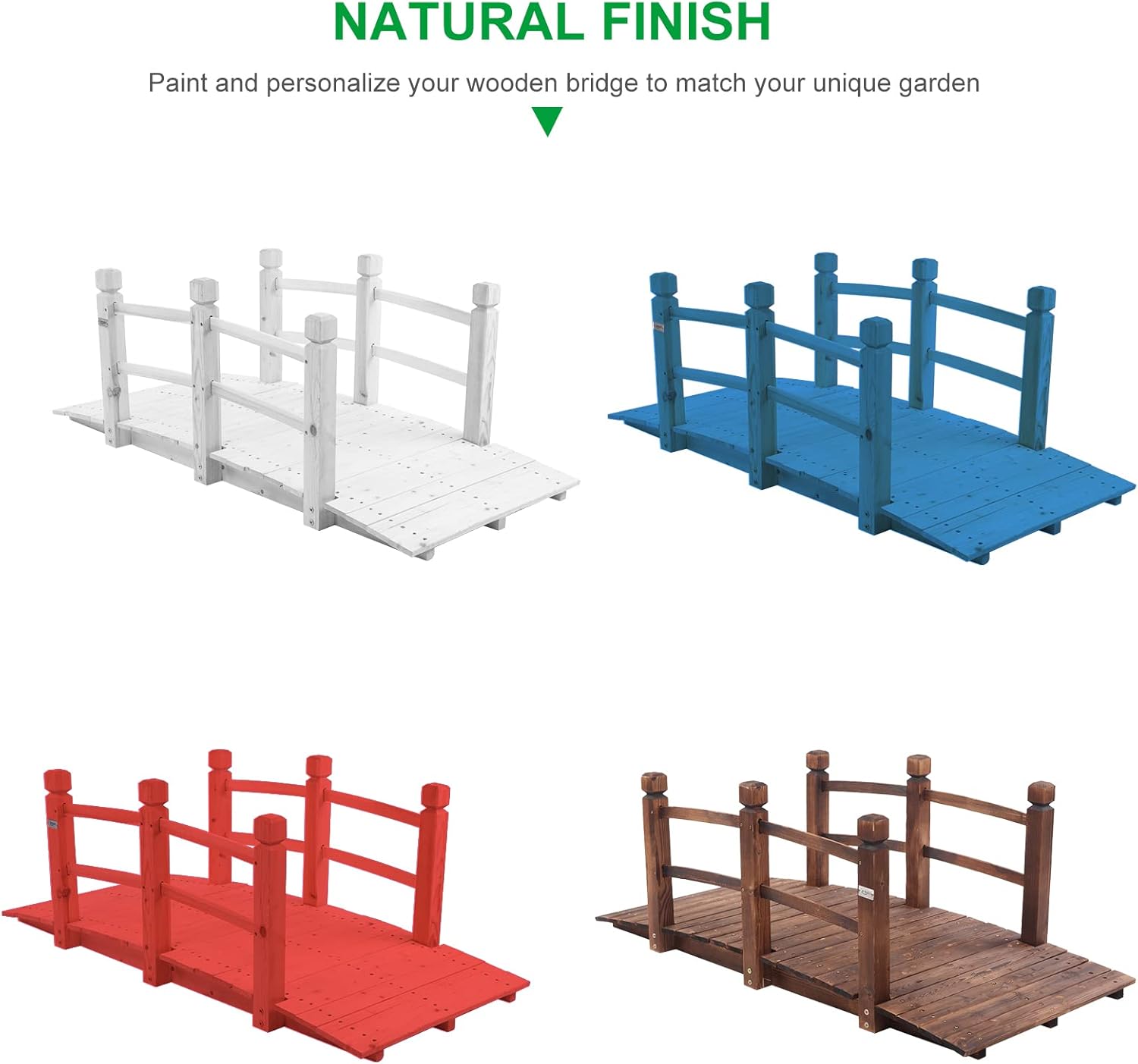- ✔ [Decorative Bridge] Natural finished fir wood makes it a beautiful additional walkway to your garden, yard, creek or farm. Welcome to DIY your bridge by painting it with any color you like.Dimension: 59"(L) x 28"(W) X 21"(H)