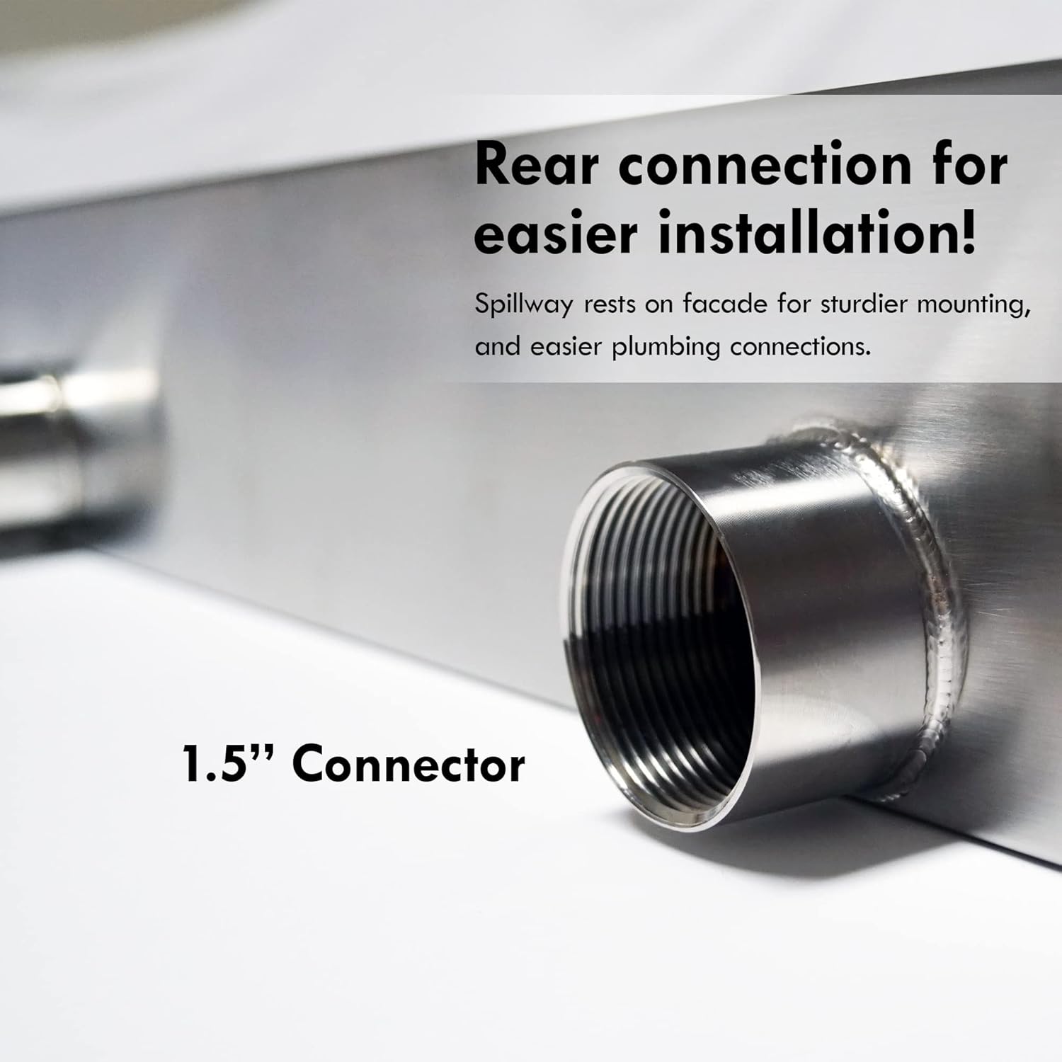 - Water inlet is One (1) 1.5" Female Thread Located on spillway center back. We recommend 1000 GPH per foot of spillway length for proper flow