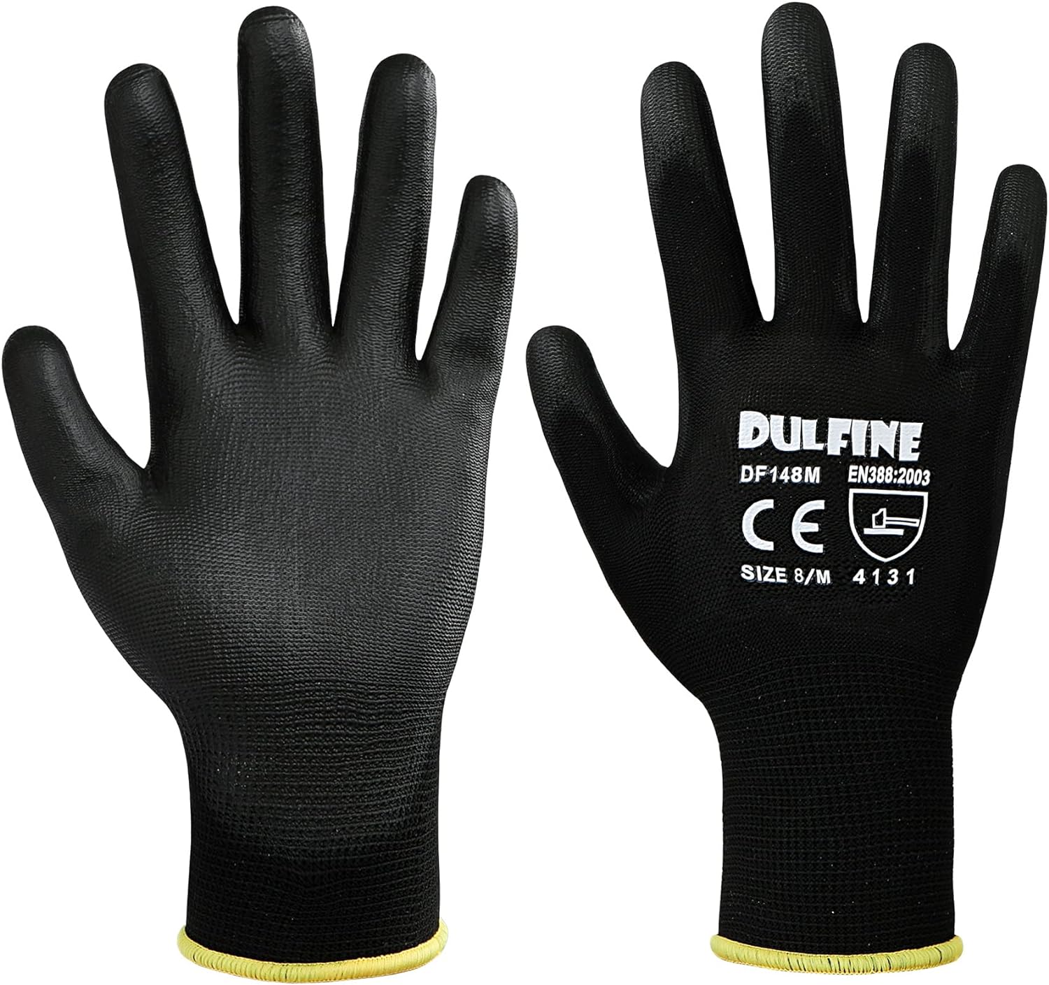 DULFINE Ultra-Thin PU Coated Work Gloves-12 Pairs,Excellent Grip,Nylon Shell Black Polyurethane Coated Safety Work Gloves, Knit Wrist Cuff,Ideal for Light Duty Work. (Extra Large)