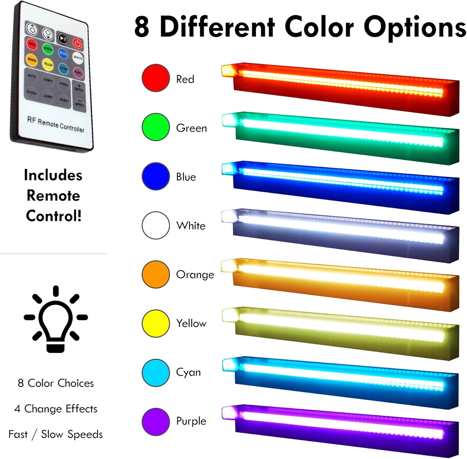 - Includes remote control for power control and brightness (color selection and changing speed if equipped) and fully removeable light bar