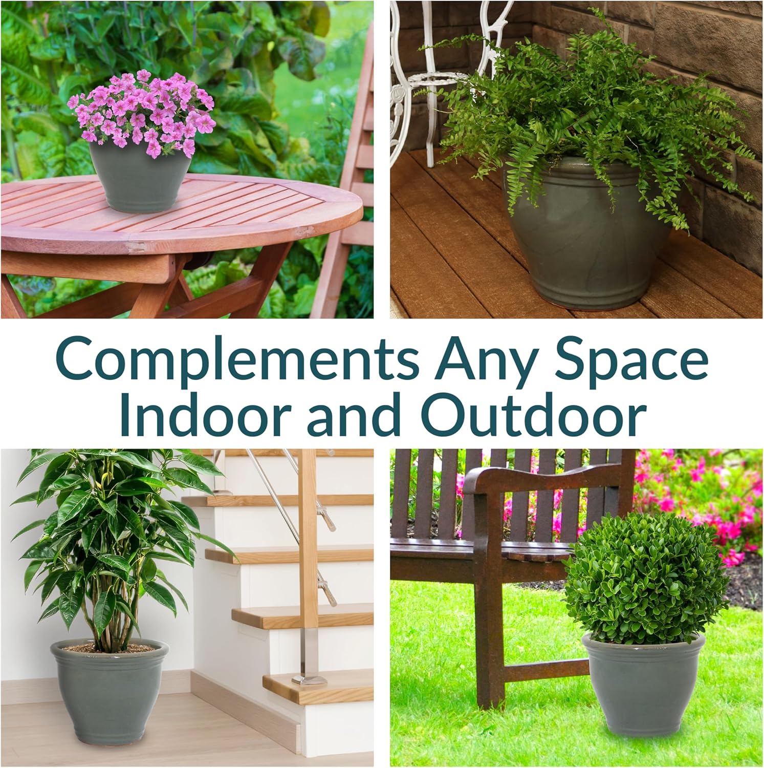 - VERSATILE PLACEMENT: Use this round garden planter on the patio, deck, or porch to add flowers to outdoor spaces, or set the planter in the sunroom, living room, or dining room to bring life to indoor spaces. If using it indoors, place a saucer (not included) beneath the flowerpot to prevent water and soil from leaking on the floor. The drainage in the bottom of the pot provides optimal air circulation and prevent water from pooling.