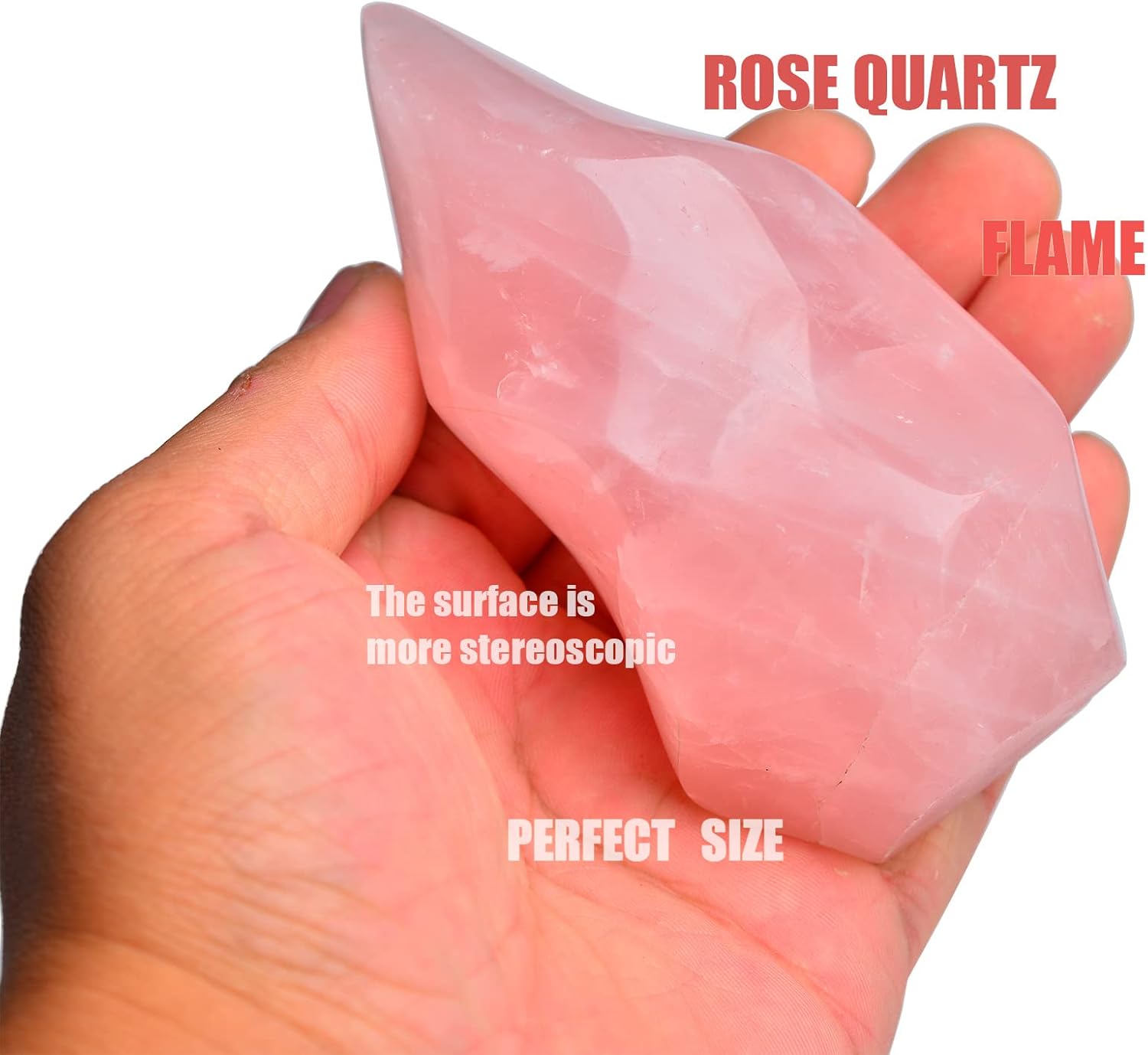 - Size: about 3.5-5.5" tall, 1.35-3.5" wide, 0.6-1.0 LBS weight, its shape is like a flame. the actual size and color are a bit different from each other, we will send by random from available lot. Rose Quartz 01 is more three-dimensional than 02.