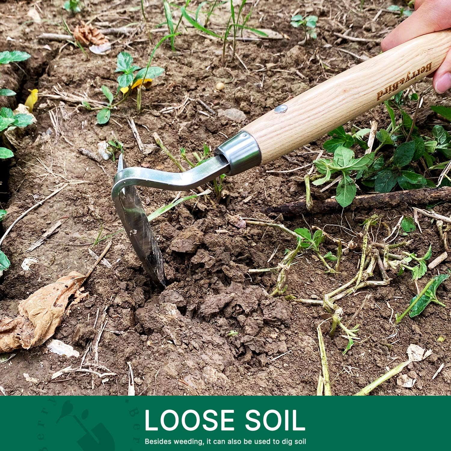 Berry&Bird Japanese Weeder-Scraper-Hoe, 12.67-Inch Gardening Sickle Hoe, Stainless Steel Bent Angle Weeding Sickle, Weeder Hoe with Ergonomic Ash Wood Handle for Weeding, Soil loosening, Digging