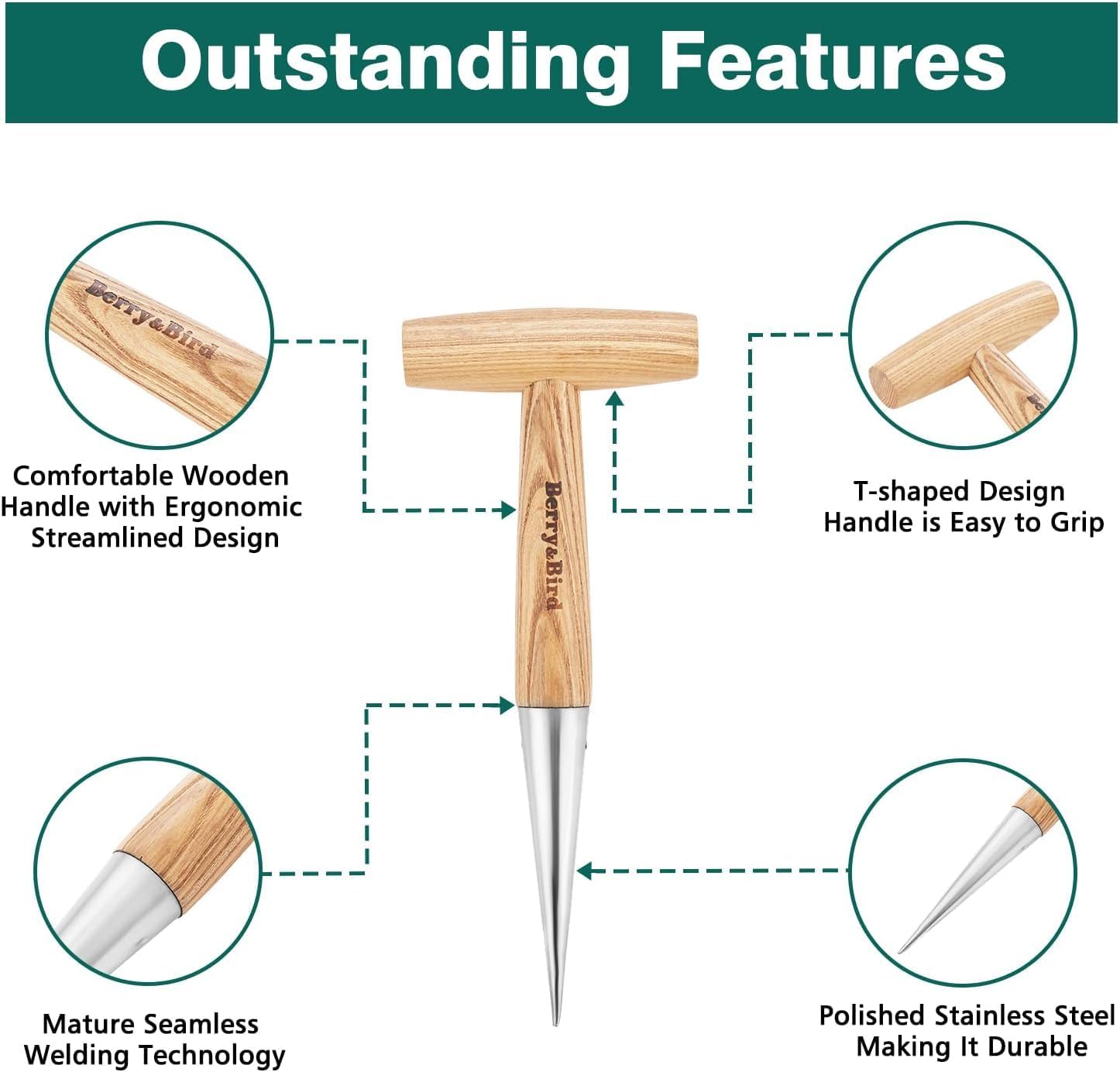 Berry&Bird Hand Dibber, Stainless Steel Sow Dibbler with Wood Handle, Garden Hole Punch Dibbler Tool for Planting Seeds & Bulbs, Hand Held Bulb Planter for Planting Flowers Tulips, Daffodils, Dahlias