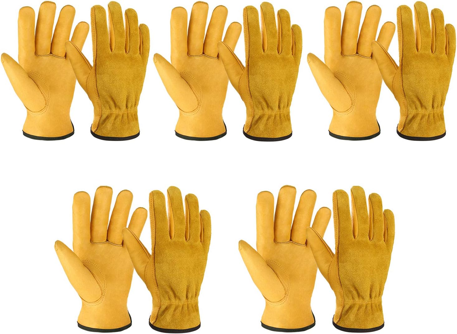 OZERO 5 Pairs Leather Work Gloves Flex Grip Tough Cowhide Gardening Glove for Wood Cutting/Construction/Truck Driving/Garden/Yard Working for Men and Women (Gold,Medium)