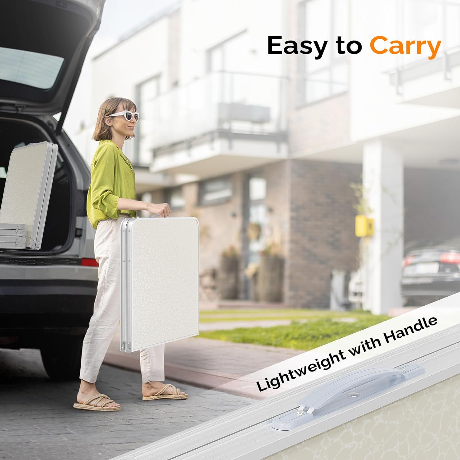 - LIGHTWEIGHT&FOLDABLE: MDF tabletop and aluminum feet make its weight just 9.9 lbs. The feet could be set off and tabletop could fold in half, foldable like suitcase(23.8"*23.8"). It is convenient to carry it to anywhere with its soft carry handle.