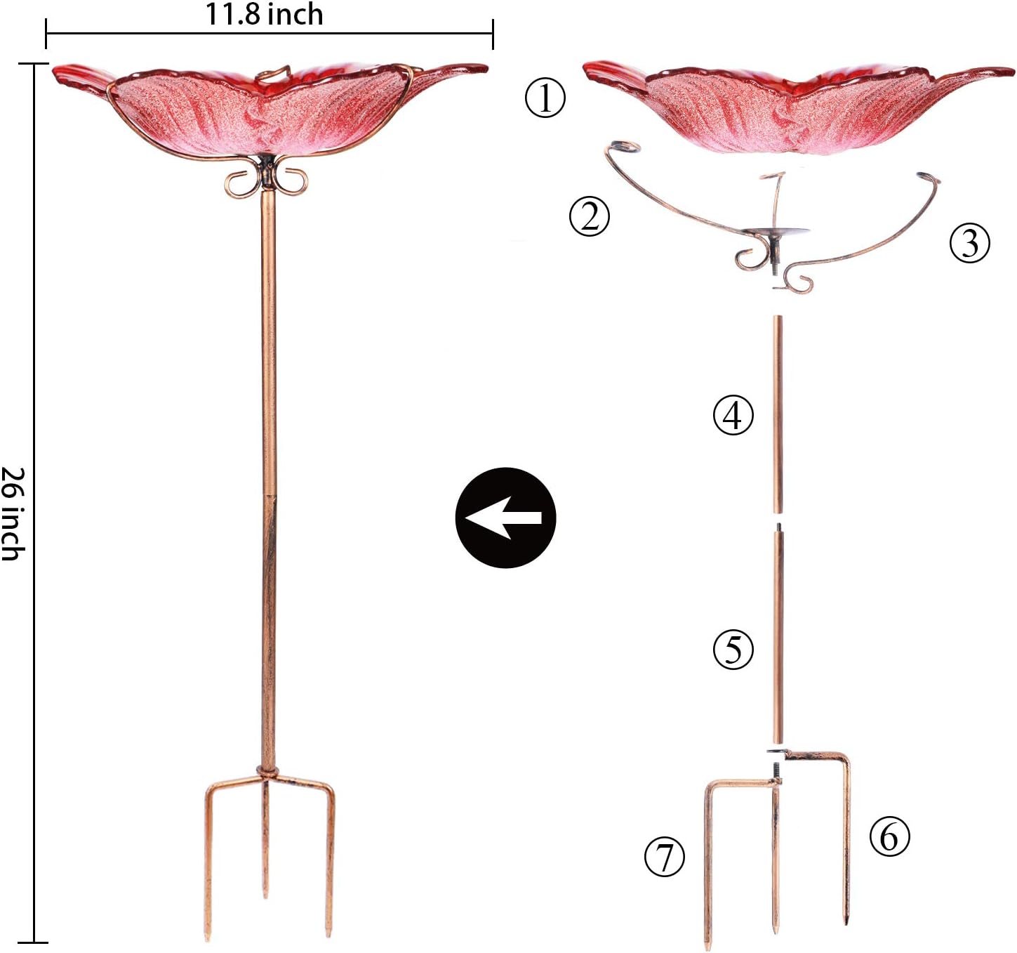 - package include : 1*glass birdbath bowl+6 metal parts+1*assembly instructions. If you have any doubt about outdoor birdbath, Contact us pls, and we will deal with it asap
