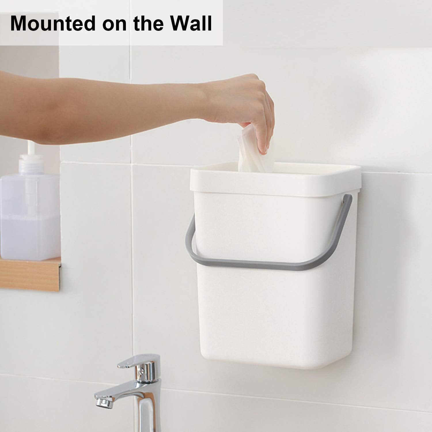 - Hangable & Mountable: The small trash can with lid can be easily hung on the doors of kitchen cabinets, office lockers or bedroom drawers. Moreover, this food waste caddy can also be wall-mounted to your cupboard, kitchen wall or bathroom wall with adhesive pad.