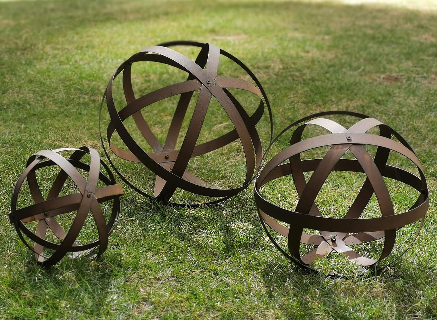 - Read before buying: the decorative sphere POSSIBLE smaller than you expect, Small sphere 7.15" Dia, Middle 9.9"dia, big one is 11.9" dia inches, Metal Sphere in Rusty Finishing effect (not real natural rusty).