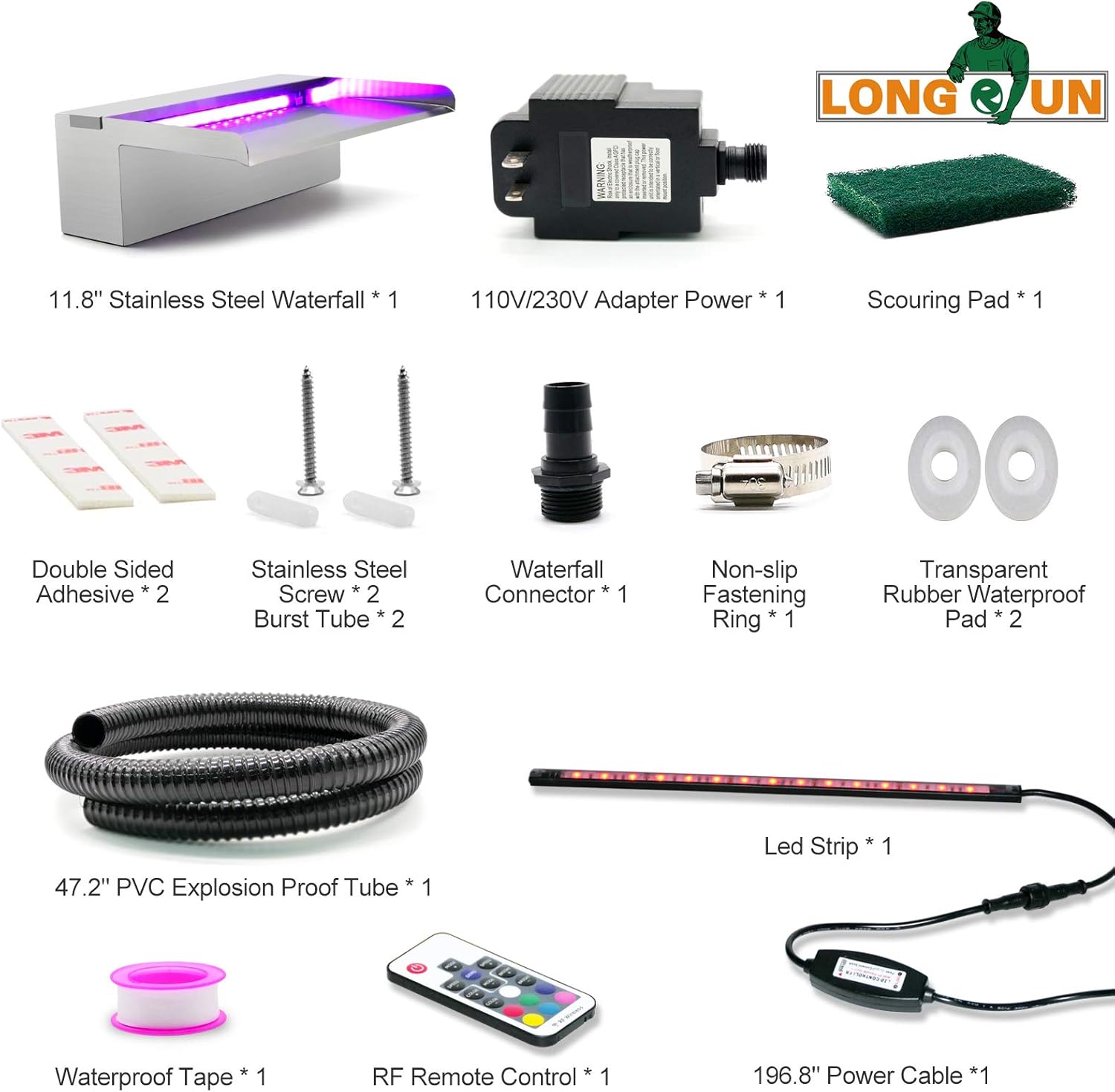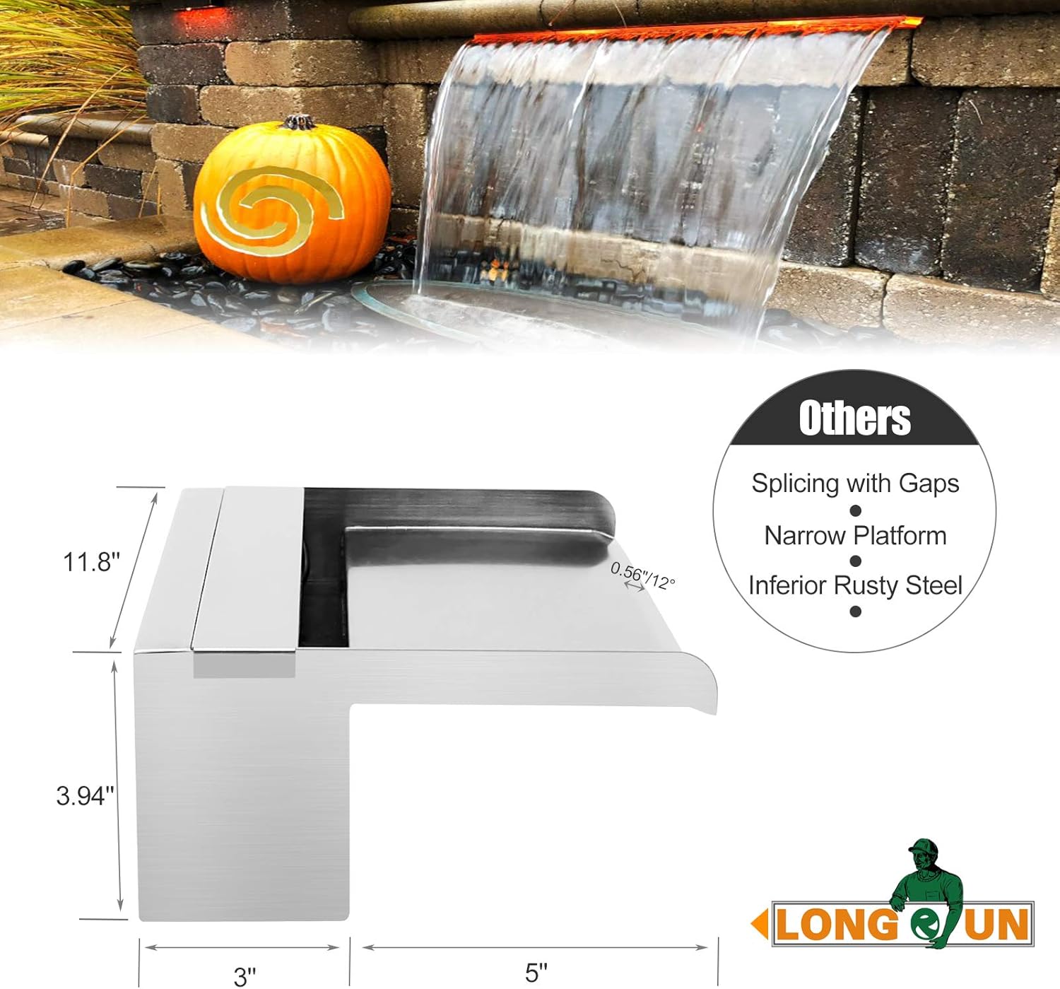 LONGRUN Waterfall Spillway Stainless Steel Pond Waterfalls with Color Changing LED Light, Outdoor Pool Fountain Water Spillway Waterfall Kit for Garden Patio Swimming Pool Koi Ponds Decoration-11.8"