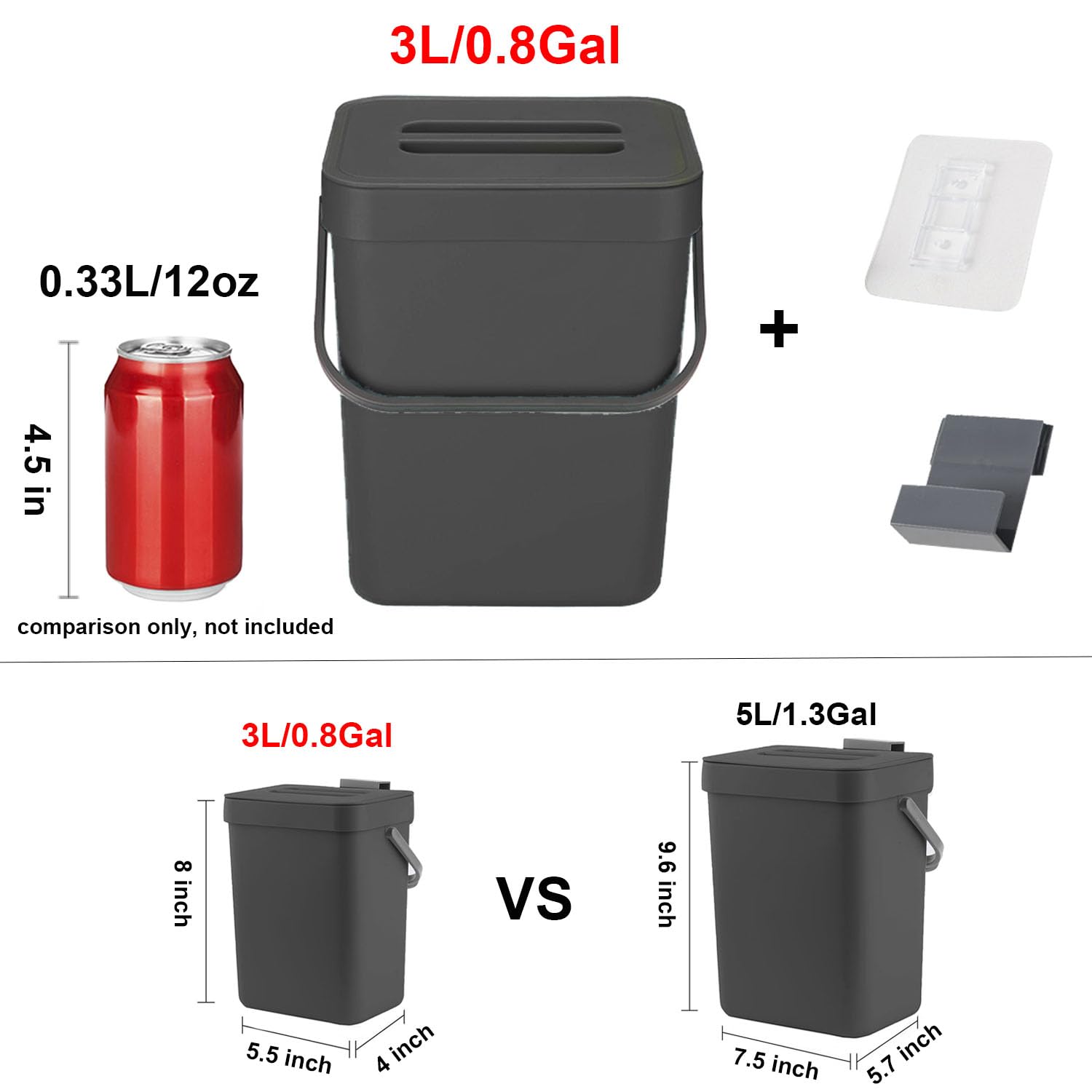 - Small & Compact: 0.8 Gallons / 3 Liter. (8 inch*5.5 inch*4 inch). The mini trash can doesn't take up too much countertop space. Fits on a countertop, under the sink, or in the pantry, and works well for small living spaces like dorm rooms, apartments, condos, RVs, cabins and campers.