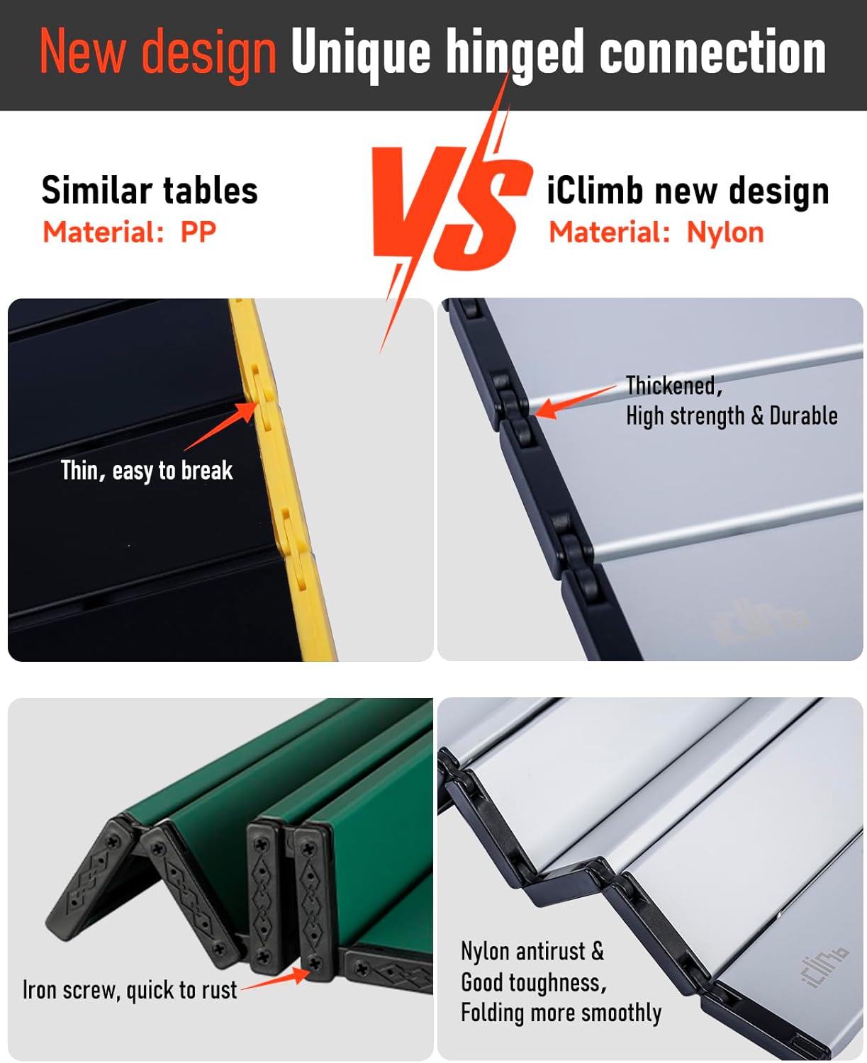 - Ultralight, made of aerospace-grade aluminum alloy, only 3 lbs; Max Load 66 lbs; Unlike wooden or nylon-top tables, this table is durable, waterproof, corrosion-resistant, easy to clean; Sturdy joints and anti-slip feet keep the table stable, with legs that won’t fold, bend, or slip on any terrain; Very easy to set up, just open the base frame and attach the tabletop, enjoy your leisure time in seconds, video guide available on this page.