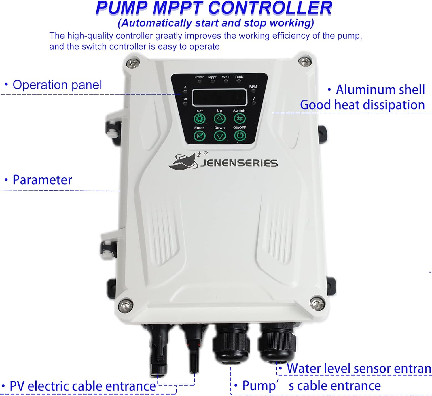 - [Specification]: JENENSERIES Solar Water Pump 48V DC,3 Inch Dia,9.8ft extension cable, Max head 120m,1.8m³/h Flow, PV open circuit voltage 42-100V with MPPT controller for farm, Garden, home, pool, Industrial