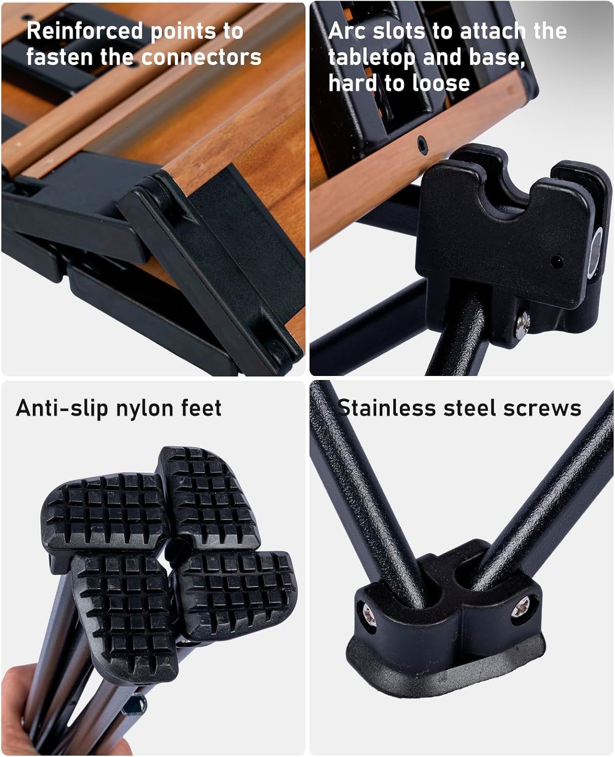 - Ultralight, made of aerospace-grade aluminum alloy, only 3 lbs; Max Load 66 lbs; Unlike wooden or nylon-top tables, this table is durable, waterproof, corrosion-resistant, easy to clean; Sturdy joints and anti-slip feet keep the table stable, with legs that won’t fold, bend, or slip on any terrain; Very easy to set up, just open the base frame and attach the tabletop, enjoy your leisure time in seconds, video guide available on this page.