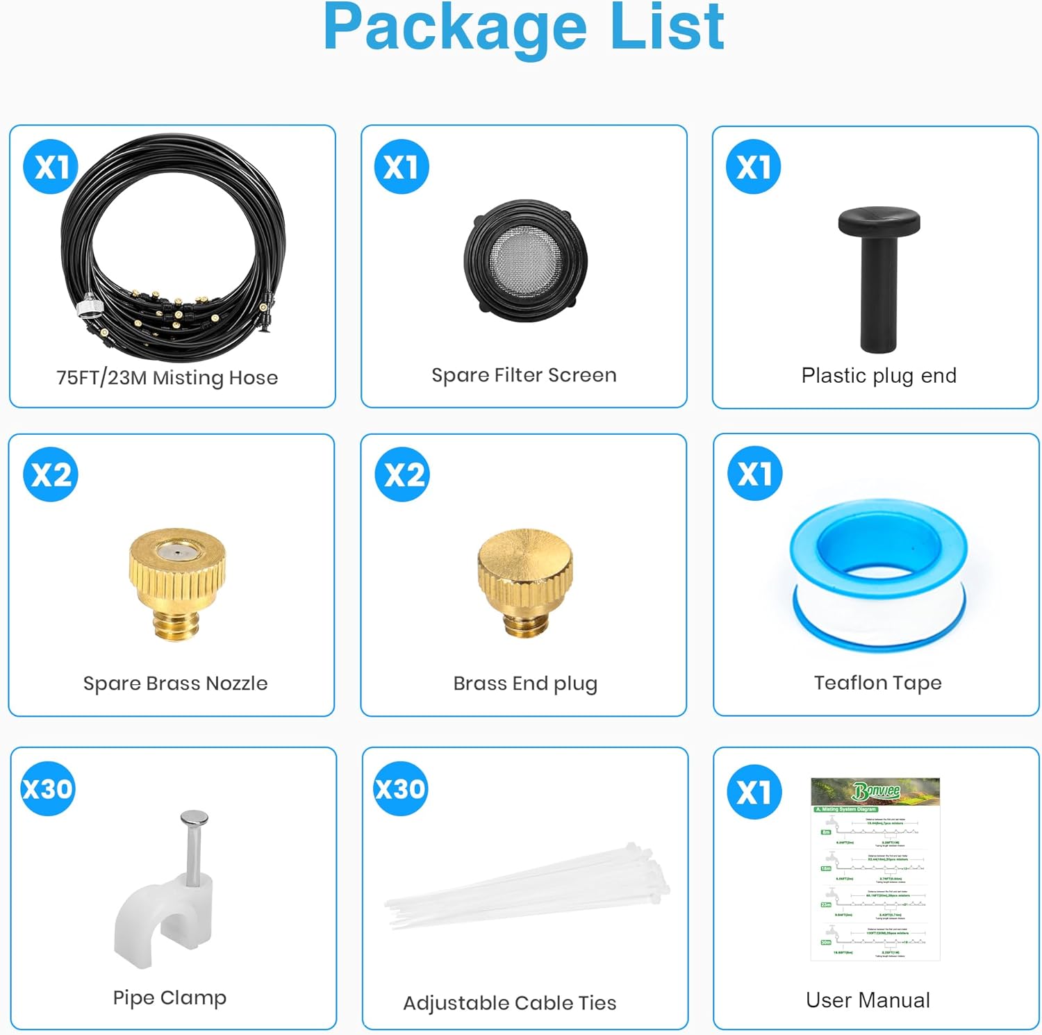 - š” 75FT Misting System For Large Setups: Equipped with 75FT (23M) tubing and 28 high-quality brass nozzles, great for cooling large patios, greenhouses, trampolines, umbrellas, pet zones, and more. Effective and easy to install.