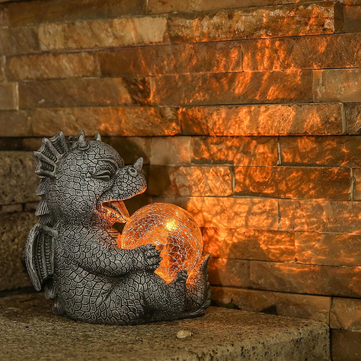 - Whimsical Solar Dragon Statue – This 7.1-inch tall enchanted baby dragon clutches a glowing solar-powered orb that charges by day and illuminates by night (6-8 hour runtime). Perfect for adding fairytale charm to gardens, patios, or fairy gardens. Weatherproof resin construction withstands all seasons with zero maintenance!