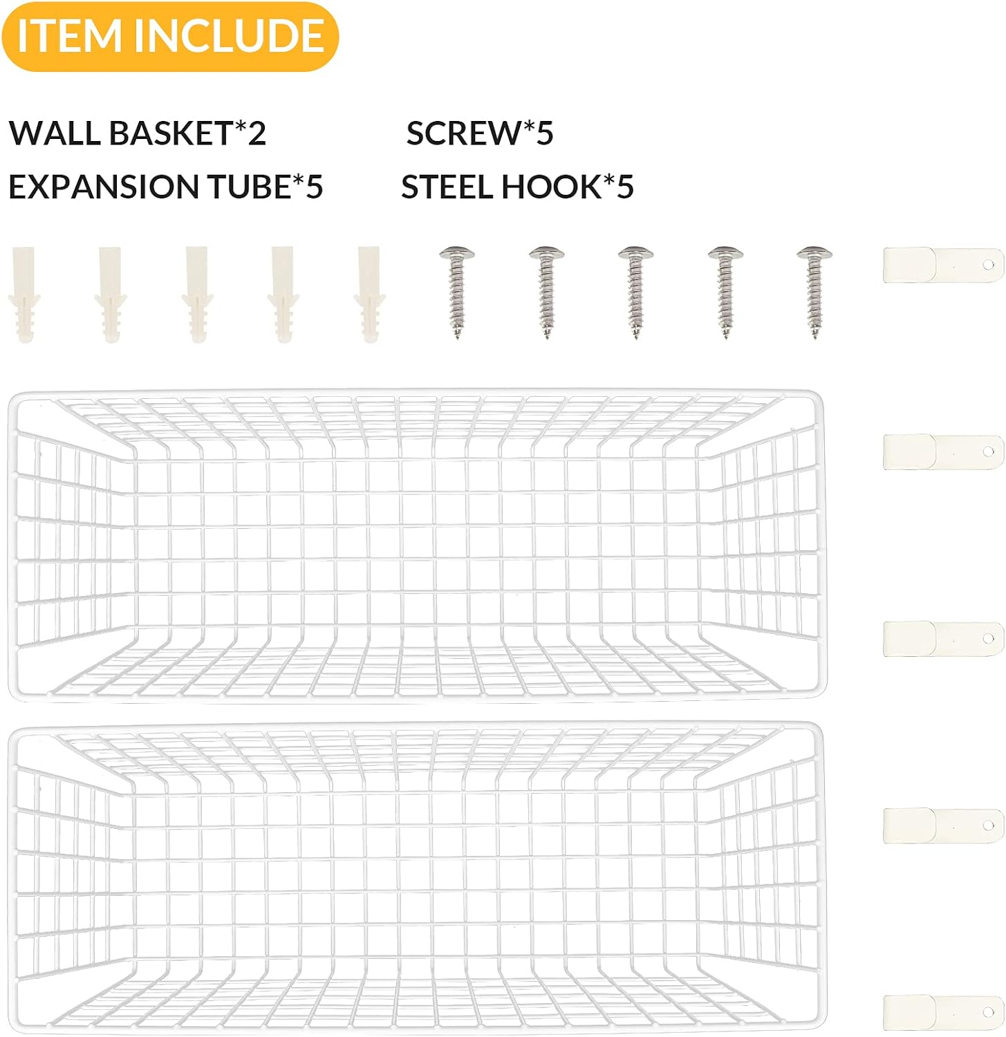 - Easy Installation: Includes 2 hanging baskets, complete with mounting hardware set (5 steel hooks + 5 expansion tubes + 5 screws). Simply mount the hooks to the wall using the included expansion tubes and screws, then hang the basket - you're ready to go! If you prefer not to hang it on the wall, you can also place it wherever you want. It's a versatile and convenient choice.