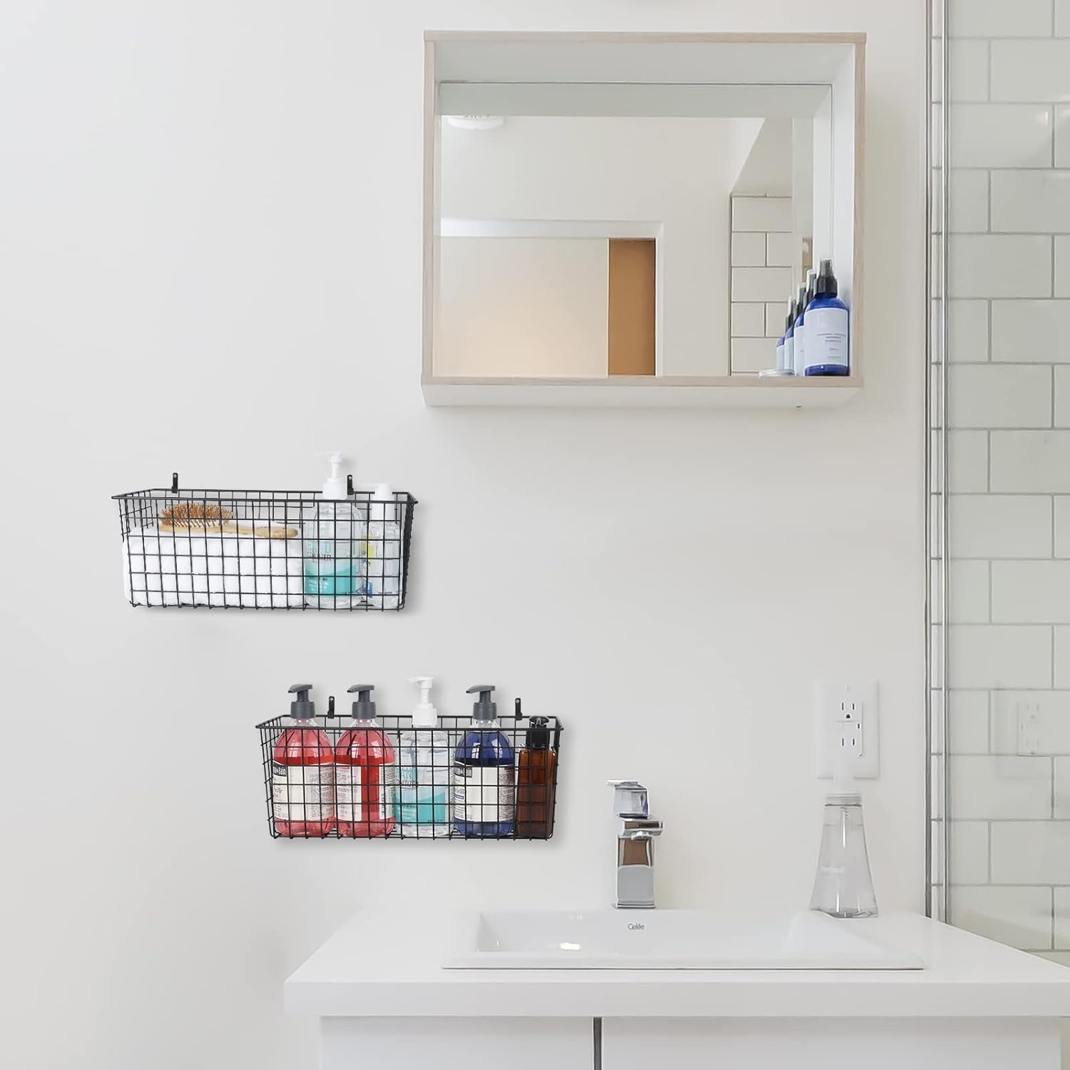 - Sturdy Metal Wire Baskets: These metal wall baskets are made of solid metal wire with anti-rust coating, sturdy and durable for long lasting. The wire baskets for organizing open design allows you to see the items inside the basket, which makes it easy to find the item you need. And easy to clean, just wipe clean with a soft damp cloth and dry towel.
