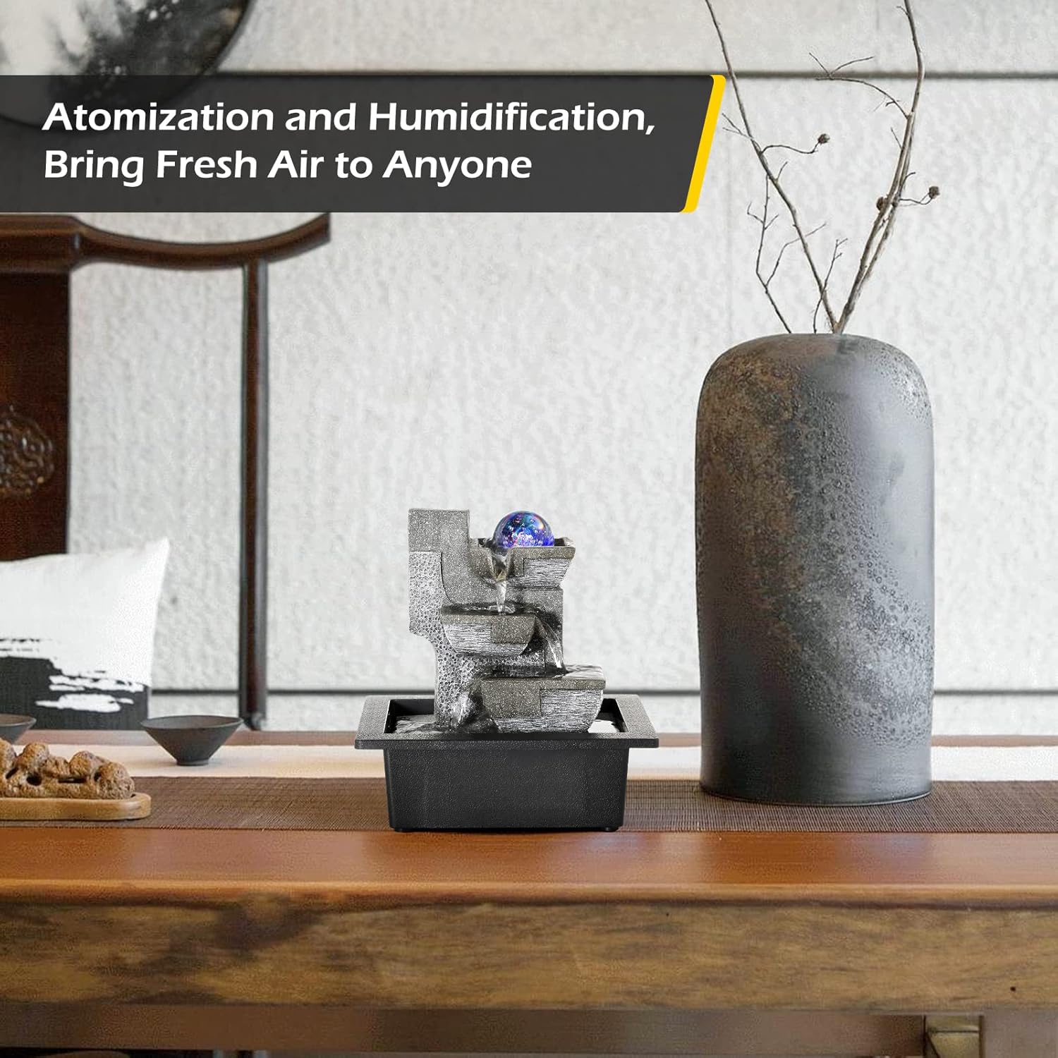 - [Beautify Surrounding]- The decoration desktop water fountains indoor comes with color LED rolling ball lights, which can add beauty to any room decor. With the flow of water, the flowing water from the indoor desktop water fountain can increase the air humidity in the room and can bring fresh air to anyone.