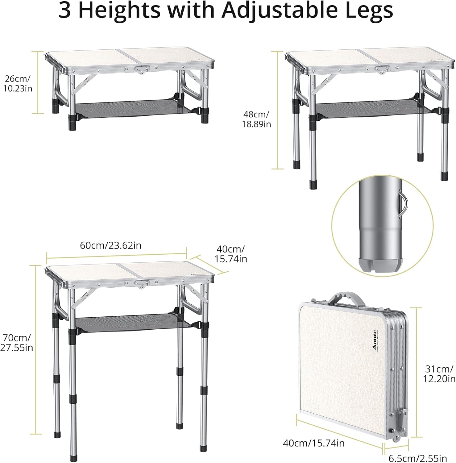 - 3 Adjustable Heights up to 27.5 in: You have 3 fixed length for the legs of the table with a height of 10, 19.4 and 27.5 inches (26, 48 and 70cm). You can sit on the lawn when picnic with the lowest height. Or you can siting beside the table with chair when adjusted to the highest height