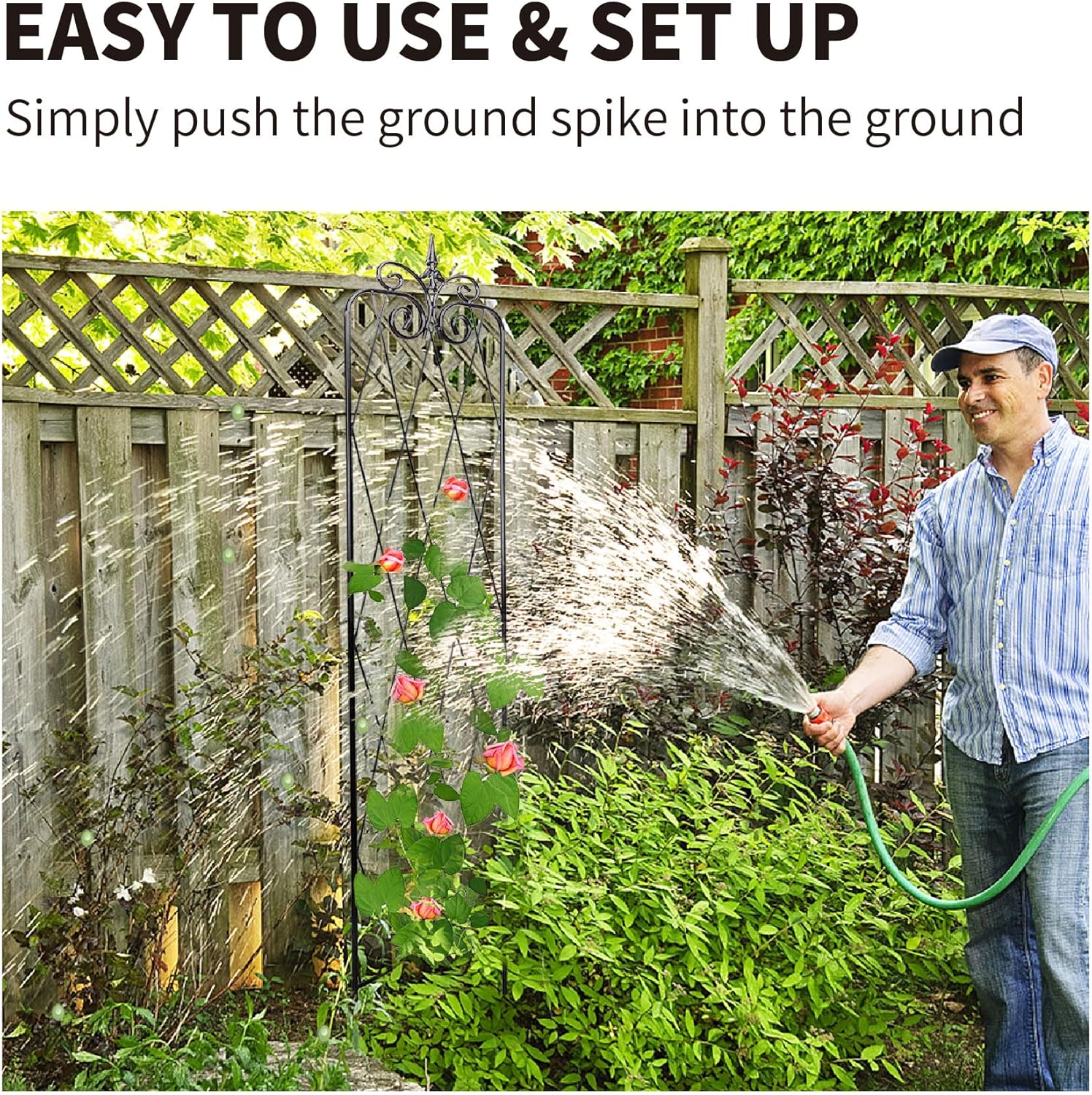 - Sturdy Stability Structure: With heavy duty iron frame and powder coated welded material. 8 inch ground spike inserts into the ground and add stability to the trellises.
