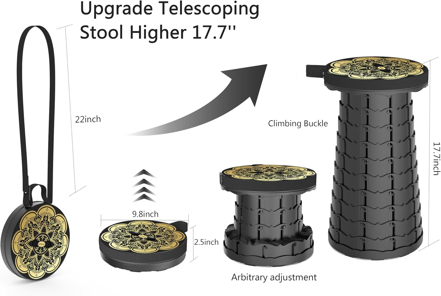 - ăAdjustable Heightă The camping stool is adjustable and it can be set to your desired height within the range of 2.4 to 17.8 inches. Even when itâs not open you can still sit on the soft round part. The telescopic stool comes with a long shoulder strap, you can hand-carry or on shoulder. It will give you a comfortable short break.