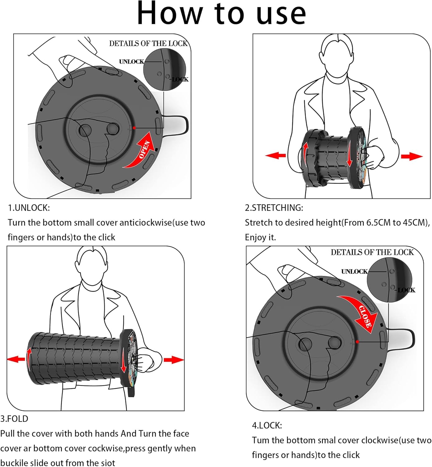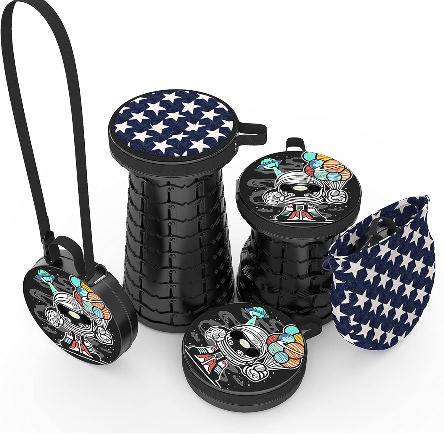 - ăU.S. Patented,Unique Pattern Designă Unique stable structure allows the pop up stool to open and close easily in just seconds, and it locks firmly in place once opened. Folding stools for adults portable is convenience,lightweight and Safety! These are really achieved through careful structural design.The patented pattern design give you a good mood. Suitable for yourself or a good choice for family, friends and relatives .