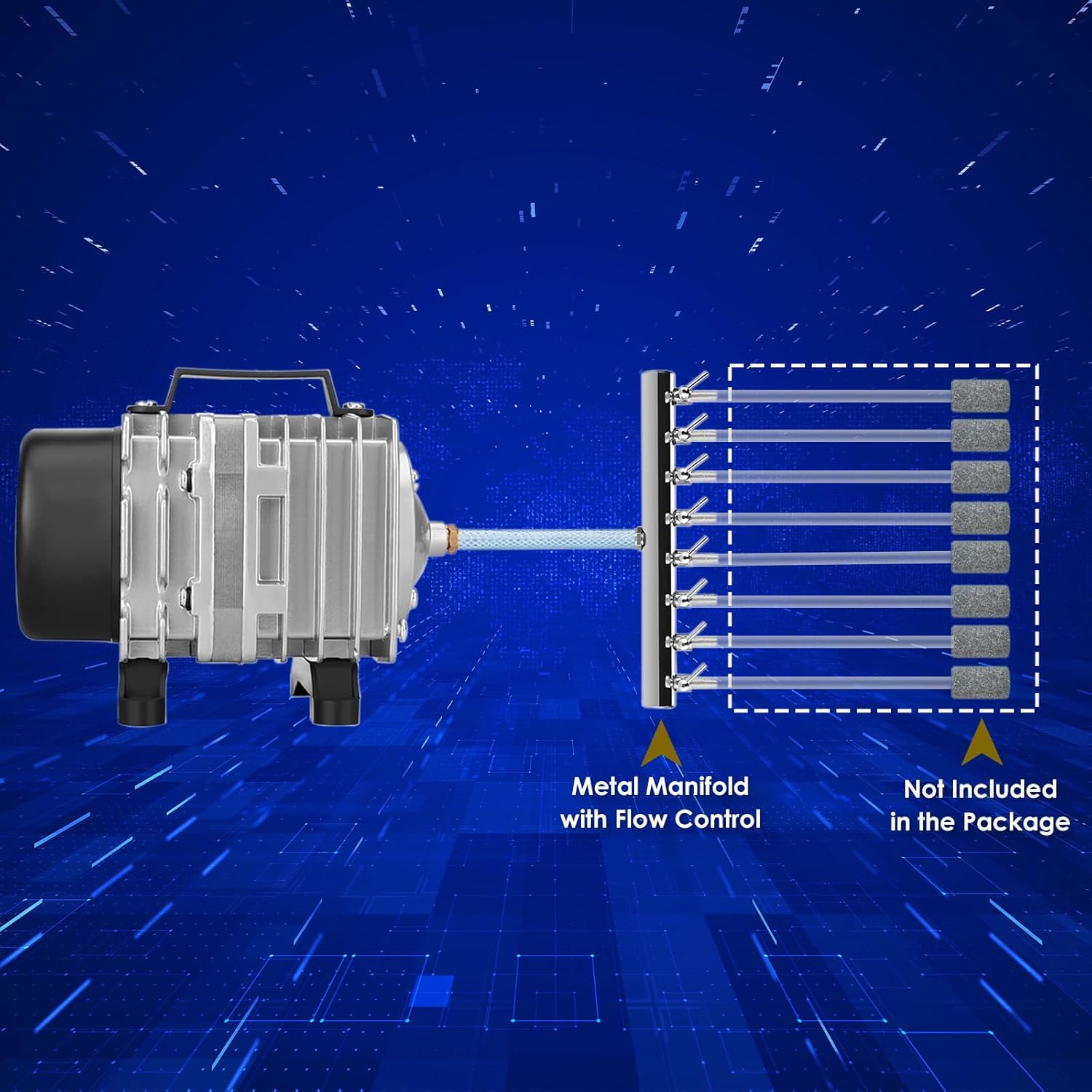 - ACCESSORIES – A short piece of hose and a 8-outlet volume adjustable metal manifold are included in the package of this pond aerator to facilitate the application. Users only need to buy 3/16” standard airline tubing and air stones to start the operation.